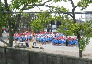 There were lots of children let loose from school or Kindergarten and playing in the river. The teachers were constantly chasing after them and tried to get them back behind closed walls. Once captured, the kids were forced to stand to attention at the drill yard.