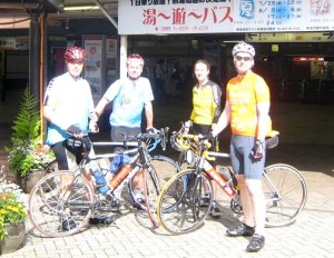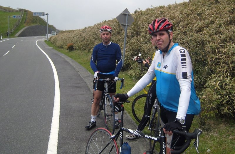 We then took the obligatory BEFORE photo and started to ride along the rather congested coast road down to Ito. There are a lot of ups and downs and when we finally reached Ito we were properly warmed up for the climbs to come [Obvious the better option than to jump out from the Shinkansen and immediately tackle Atami Toge]. We turned left to route 12 which led as to two climbs over Hiekawa (360 m) and Kokuto [? 国土峠] m (510 m) followed by two fast descents through the beautiful landscape. More or less without break we came to Yushima, where we had been some weeks before as well. This is a nice Onsen town but it is in a rapid state of decay. It must have been glorious times there once, when there have been less than 1000 telephones
