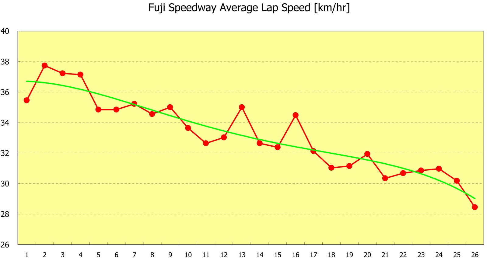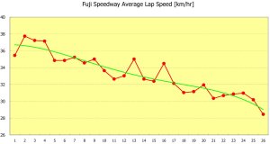 Probably I would have made a break, retired or go slower if I would have been solo, but I knew that Alain was somewhere out there fighting so I kept going. One can see my dropping performance where nice on the average lap speed chart here.
