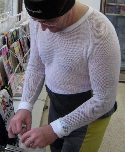 When Jerome peeled off his jacket, his space-technology grade high-tec underwear was revealed. As he explained, this garment was originally developed for the Usbekistan army as a full body condom for contraception of male army members. One cannot see this on the photo, but it fully encloses every possible boundary of the human body, starting from the toes on the neck. It also provides labour to the rural knitting community of Usbekistan, having much free time during long winter hours.