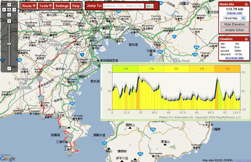 The 467 from Yamato to Fujisawa was equally smooth, albeit only one-laned. 1h40mins and almost exactly 50km into my ride I arrived at Enoshima. An average of 30km/h red lights included – not bad.