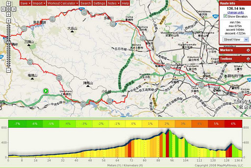 Below you can see the MapMyRide Map, resulting from Ludwigs Hollux GPS recordings, and below that you see my CICLO data. Clearly one can see the Otraumi peak to the very right of Ludwigs MapMyRide, whereas I continued after the said peak (at less than 3/4 of the distance) and added another 55 km to this ride. I reached the Tamagawa in the sunset and the starting point of Tamagawahara bridge in complete darkness. Finally, after another 20 km through urban Yokohama I was home after an eleven hour trip of 195 km distance. I have not done many longer trips, except for Itoigawa and Shimoda in the summer and for sure I have never done a ride of similar distance during the off-season (November to February). But somehow it was a good training for the upcoming race on Saturday.