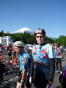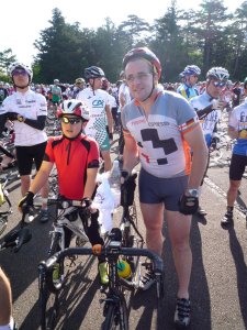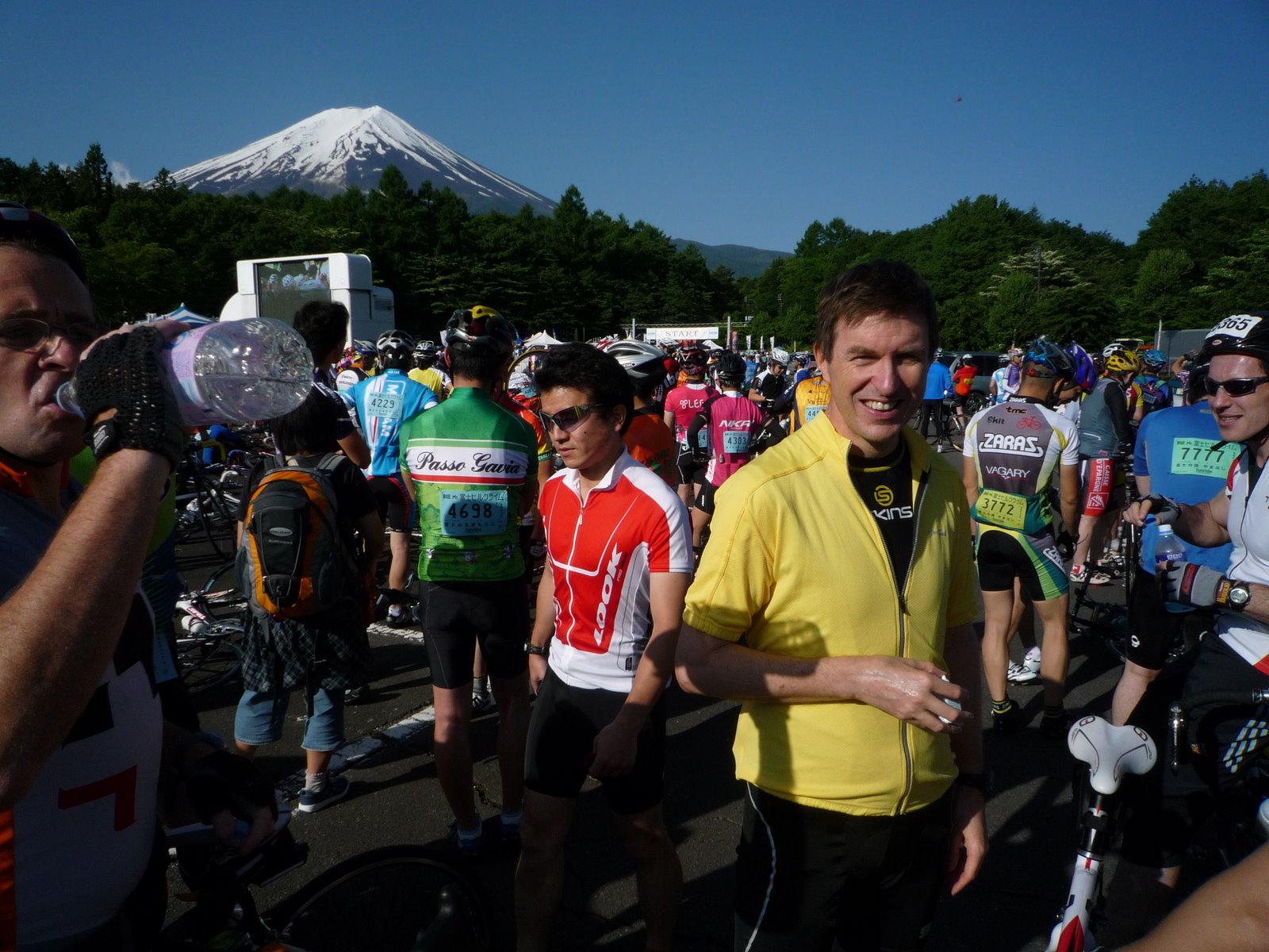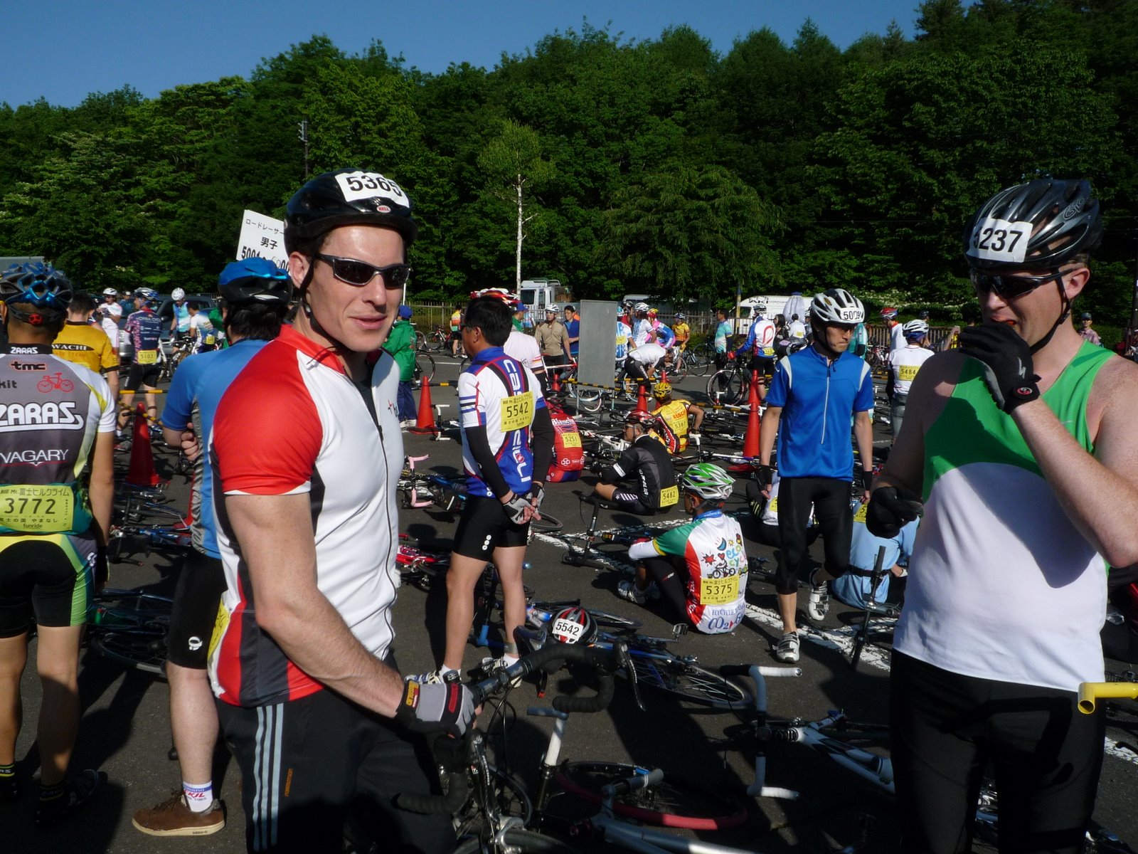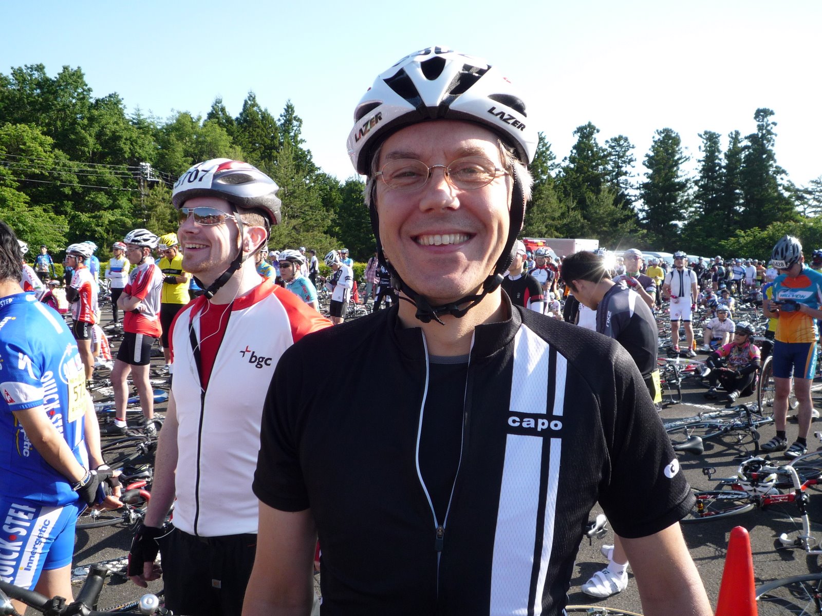 But unlike last year, the registration was conducted without pouring rain, and we were able to walk around the exhibitors and find our good friend and Assos importer, David Marx. Stephen Coady and I each seized the opportunity to buy some essential items. And despite a discouraging email from Ludwig/Manfred when he decided on Friday morning not to join the event–something about how he wished us luck but it was going to be really shitty weather to be riding on Mt. Fuji and so we were all going to die from hypothermia–the view was spectacular from the staging area on the morning of the ride, and overall the weather was close to ideal.
