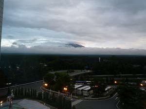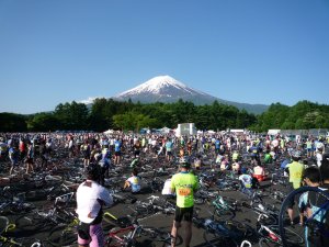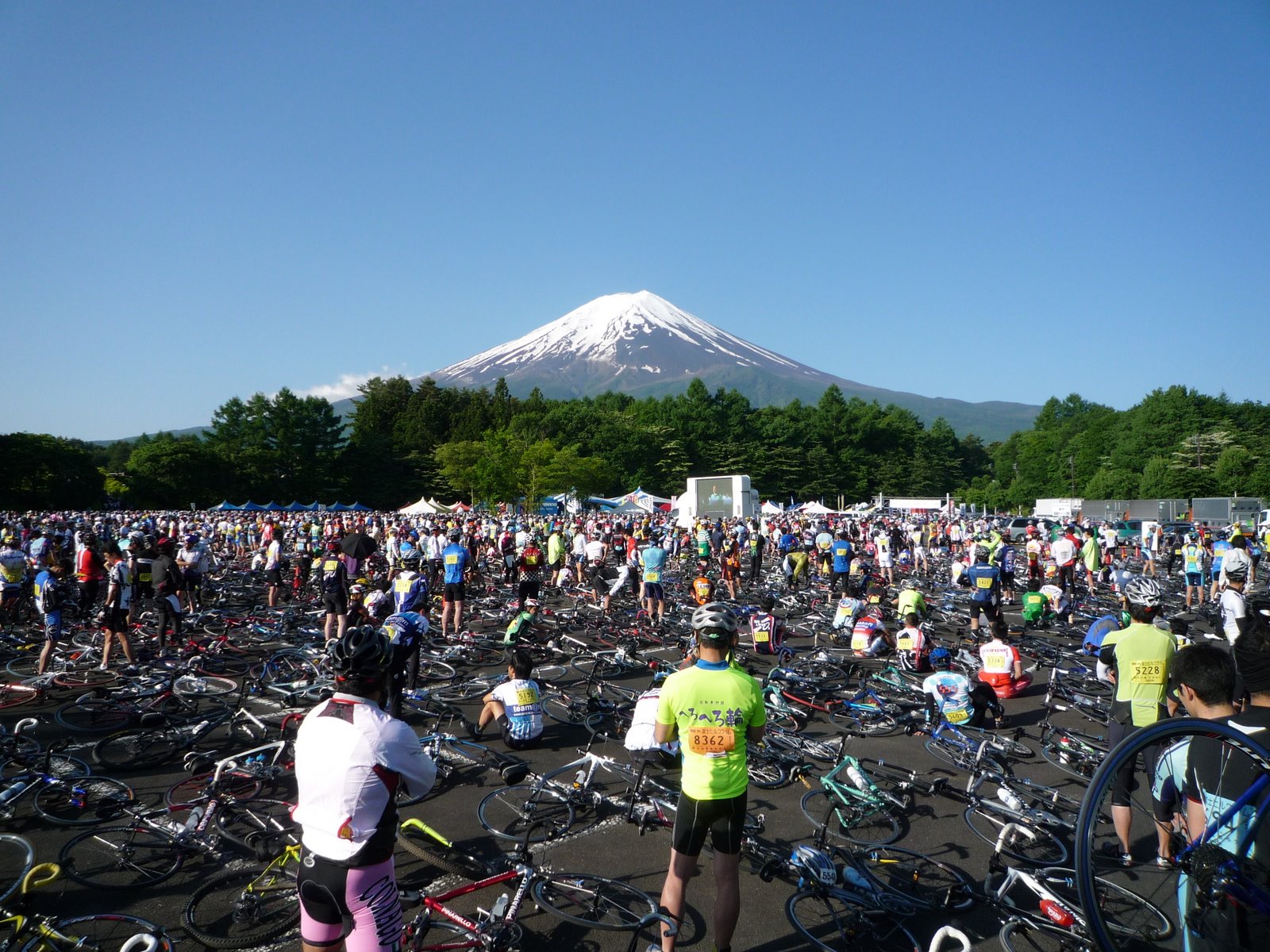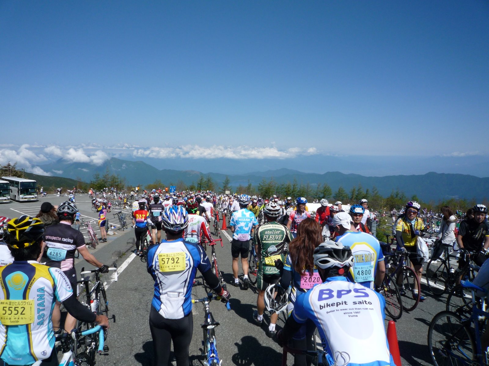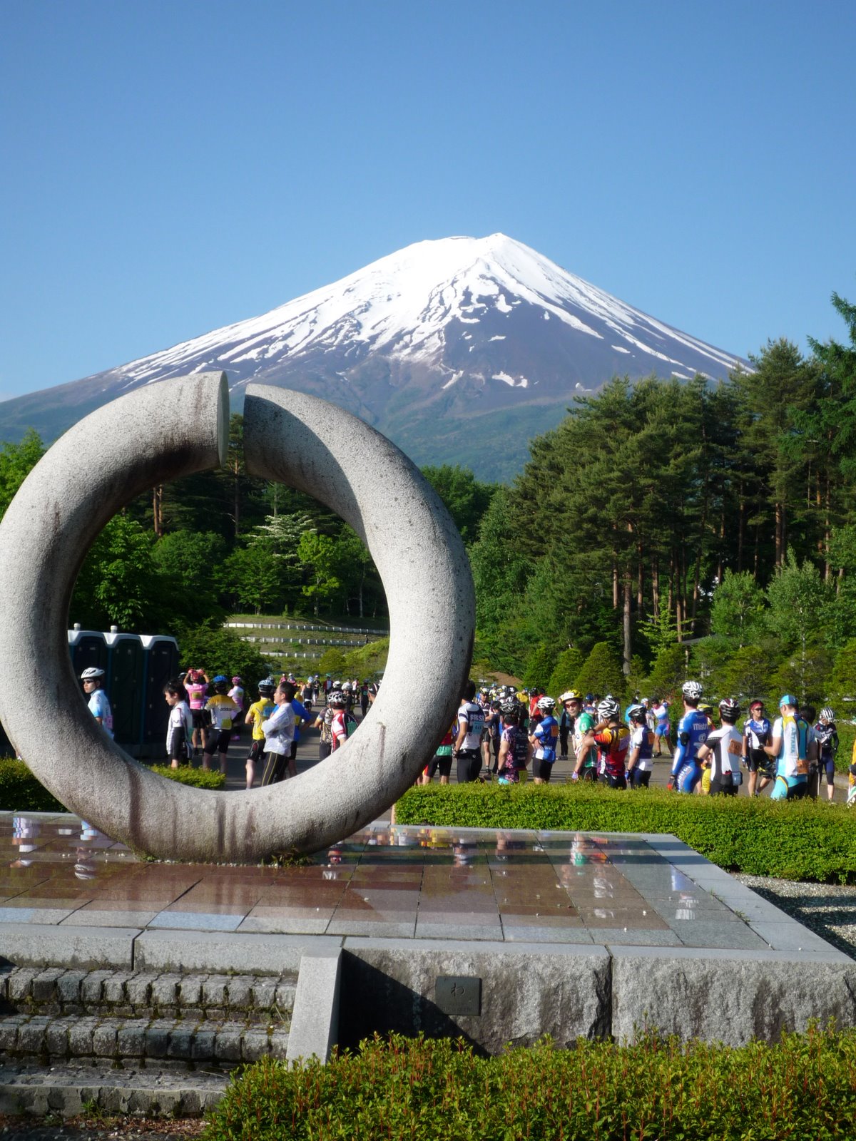 But unlike last year, the registration was conducted without pouring rain, and we were able to walk around the exhibitors and find our good friend and Assos importer, David Marx. Stephen Coady and I each seized the opportunity to buy some essential items. And despite a discouraging email from Ludwig/Manfred when he decided on Friday morning not to join the event–something about how he wished us luck but it was going to be really shitty weather to be riding on Mt. Fuji and so we were all going to die from hypothermia–the view was spectacular from the staging area on the morning of the ride, and overall the weather was close to ideal.