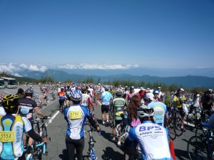 *(I think this photo is worth the extra click to see it at full size — it give the appearance of everyone and all the bicycles anticipating the attack on the mountain … though in fact they are just looking in that direction to listen to the introductory speeches and usual warnings about riding safely, slower riders staying to the left, etc.)