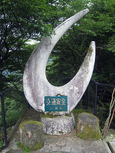 My plan was to ride up to Lake Ashino / Moto–Hakone from there and as I still felt OK I gave it a try. Luckily there is road #401 forking off from 138 so I gave it a try. This was a good decision as the road was almost empty and the climb very gentle, hardly more than 5% slope in any location. And so I made it to the top at Nagao something tunnel where I discovered a monument to traffic safety in sorry state.