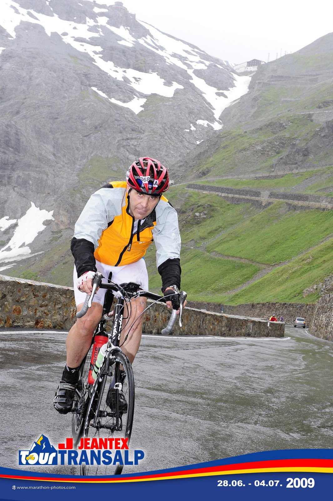The second group of passes (Foscagno and the d’Eira) was much easier, only 7-8% grade most of the way, 1000 meters elevation gain, so just a little more than matsuhime from the south side or hakone. A cool rain fell that, as usual, turned Jerome into a monster climber. I lost Jerome about 1/2 way and he climbed at 12-15 kph to the top, while I pushed on at 10-11 kph, both of us passing people and clawing our way back through the bottom of the rankings. He again waited at the top (of Foscagno), and after a little descent in the cold rain of 2300 meters elevation, we got the surprising pleasure of another climb of unknown height–just to add to the pressure of whether we would make the cutoff time or lose an hour.