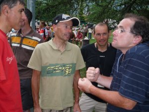 Jerome explains his „turtle“ climbing style to the Masters champion Messr. Roux and the French Connection team: