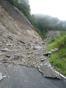 More mist after the tunnel and then a landslide that delivered half of a shotcreted rockface on the road below. Must have happened recently – perhaps because of the series of earthquakes. Another landslide, now I had to take my bike in both hands and start to climb over some really big rocks.