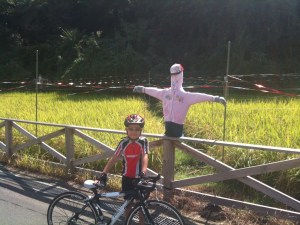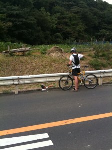 A couple of riders passed me on the climb to Yanagisawa … but fewer than I would have expected. I was slogging already, the extra stress of this event and the early hills preceding the climb having sapped my energy. My „togebaka“ time up Yanagisawa was over 2:35, 15 minutes slower than a few months ago, … then I was down the other side, with one rider (on a snazzy Pinarello FP3 with clean, white jersey and shorts) fearlessly passing me and various cars on the descent to Enzan. I stopped for water at a 7-11 near Enzan station and was just re-emerging to continue alone when … two TCC members (please tell me your names so I’ll remember next time we meet, assuming I’m in something like a normal mental state) rolled up. All I could say was „I’m doing the Brevet, got to ride“ and remounted, another nearly 40 km still left to the „official“ second checkpoint.