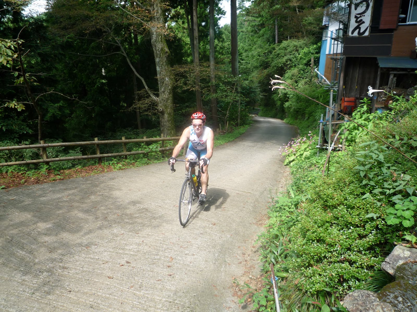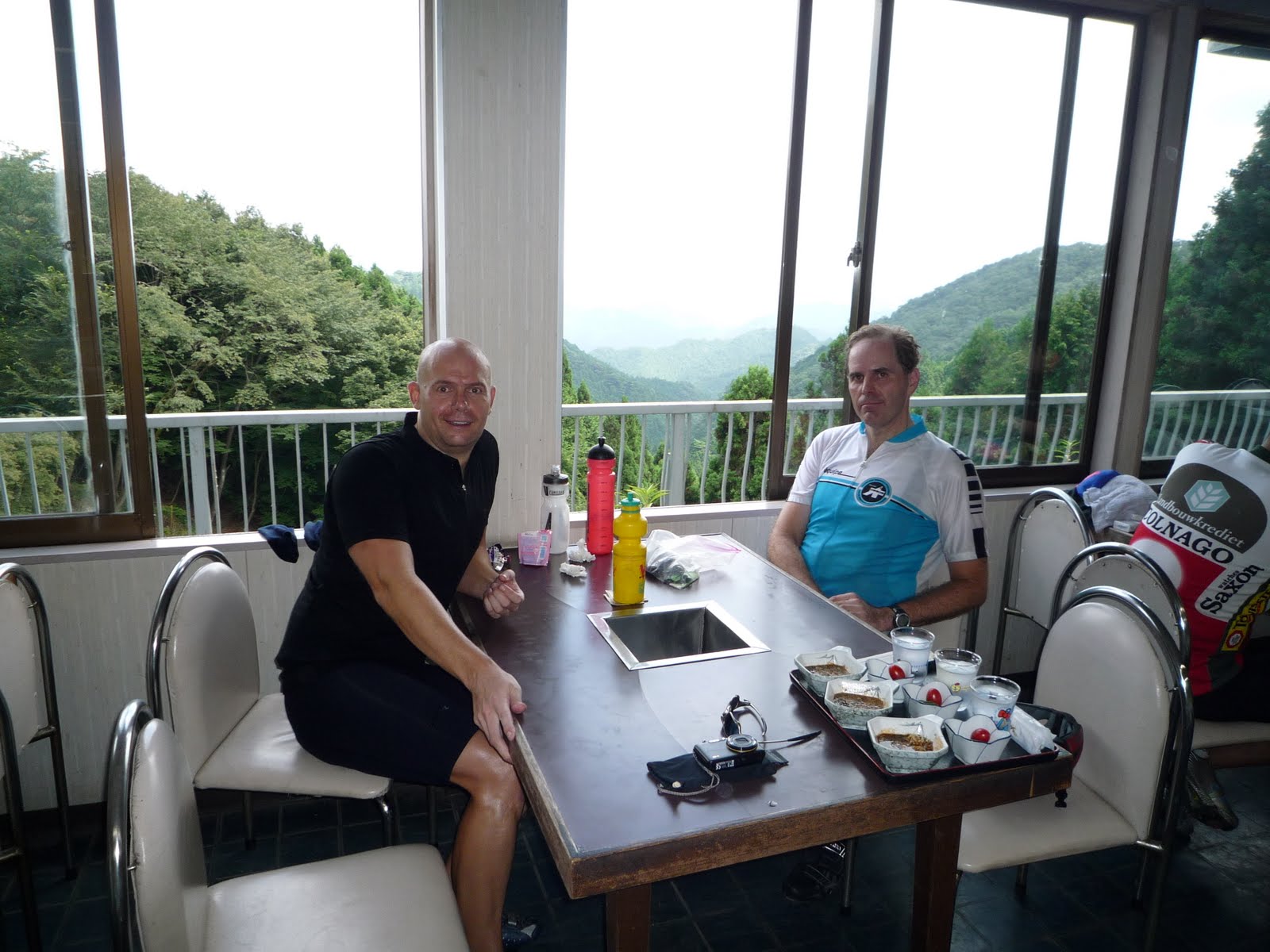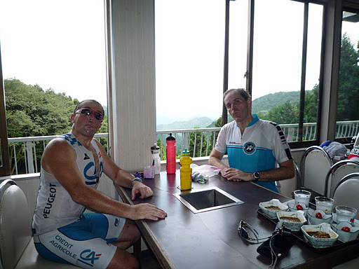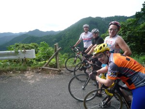[More photos from the cafeteria at Shomaru Touge (a/k/a „Okumura Chaya“, though operated by Mrs. Sato and Mrs. Saito) — hungry cyclists with gaunt cheeks, and closer-to-normal expressions. Please note that there is now an Italian restaurant within 1 km of the North side of Shomaru Pass, the „Garden House“. Is it Positivo Espresso approved? I think not, at least not yet — we owe our support to Mrs. Sato and Mrs. Saito, for their many kindnesses. They told us that their restaurant has no running drinkable water, then need to fill PET bottles at the spring below Yamabushi and bring them up in their car. So next time you visit, pick up an extra 2 liter bottle of holy water at the spring by the shrine and bring it with you up the hill — a much better training exercise!]
