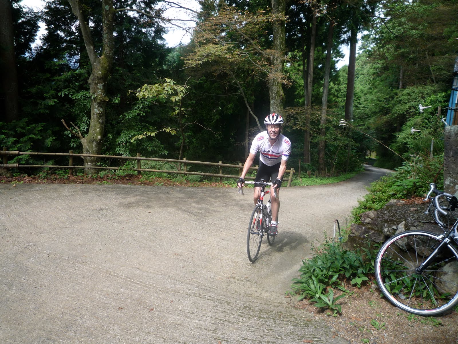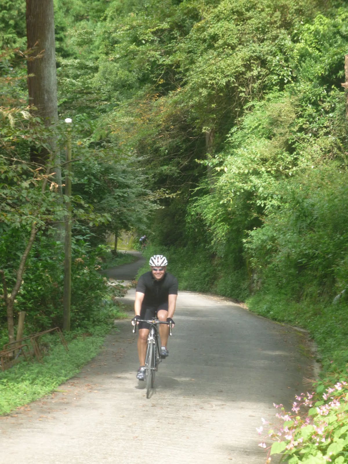 [Some more photos below of the arrivals at Nenogongen. Jerome was grumbling that a passing driver had pushed him to the side and he had needed to dismount. I actually made it up the steep section! … and all the way other than one brief place after the steepest of it and the last turn, where the road was wet and my tire slipped badly, forcing a brief dismount.]