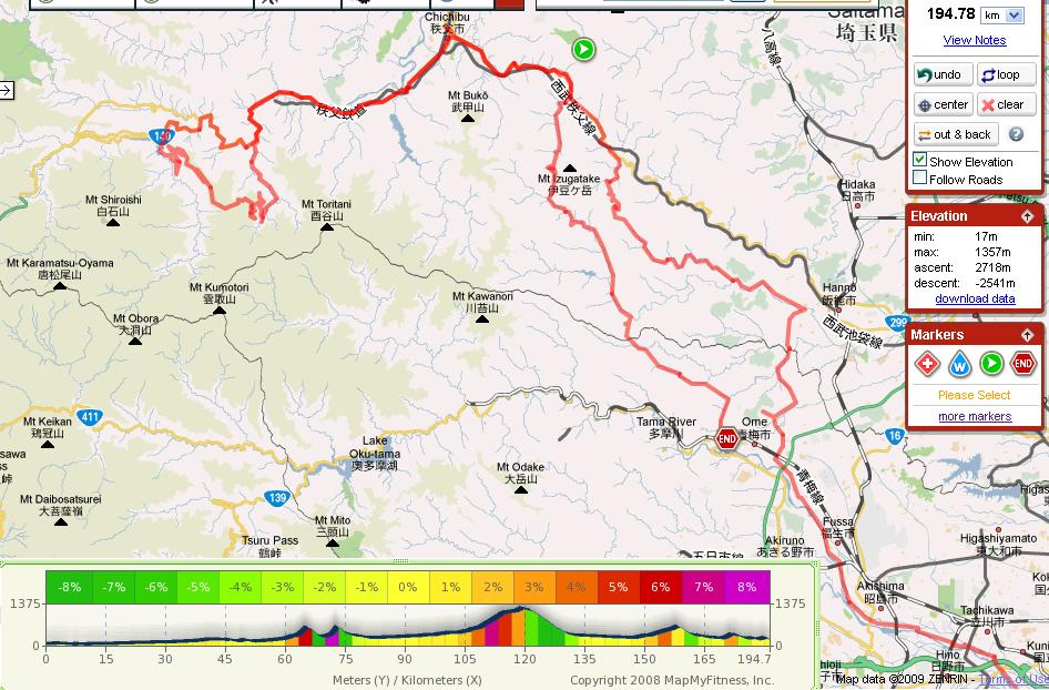 Back at the outskirts of Chichibu-shi I was tempted to return to Ome via Arima-toge, but abondoned the thought as the long crossing (including the unpredictable building site Tom, David and Nishibe-san discovered the other day) would have meant I would have reached Ome only in complete darkness. Instead I took 299 up to just before the tunnel (and while it was full of traffic, thankfully all the dumb tracks were on their way back to Chichibu rather than heading up with me) and then headed up Yamabushi Toge. On my descent I caught up with two cars and one motorcycle which were preventing me from getting one minute faster to Ome, so much to their surprise I passed the mercilessly in corners and steep long sections.