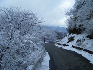1. Here is the track, recorded with my GPS tracker:http://www.mapmyride.com/route/jp/kanto/621126969376155001My ride was 208km up to Ome. 220km for Tom sounds right as I had to ride 15km more at the start.Mapmyride says we did just over 3,000m, but this includes at least Mitsumine Tunnel, so more likely we did around 2,700m. With the heavier cyclocross bike and the energy consuming riding through the snow, it felt like over 3,000m on a normal bike though.No worries about not waiting for me at the Holy Fountain. It was better you had that race and thus made it home just in daylight. You must have raced like mad. I was at Ome station just an hour before you got home.I also met a rider on a normal bike when I remounted at the Holy Fountain. Initially he was a bit slow, so I passed him and greeted him. He then followed me, always with about 10 meters distance, avoiding the impression he was wheel-sucking.With 180km and all that climbing in my legs, I felt quite miserable labouring up that last 150m pass. He initially stayed behind me, then pulled up besides me and we started chatting. Thus in no time were we at the tunnel, and from there on things were easy.He had just done Yamabushi three times and was going to another ikitomari pass in the valley down that tunnel pass. He was training for all the major hill climbs we know of – very impressive. He in turn was impressed I was able to go that fast on my cyclocross, and even more so when he learnt what I had already accomplished that day…It wasn't my best day though – I wasn't able to push my heart rate over 160, which means I hadn't rested sufficiently during the week. Hopefully next time I will be in better form – still no match for you, Tom, I am sure, but maybe a bit less of a nuisance.Cheers, Ludwig