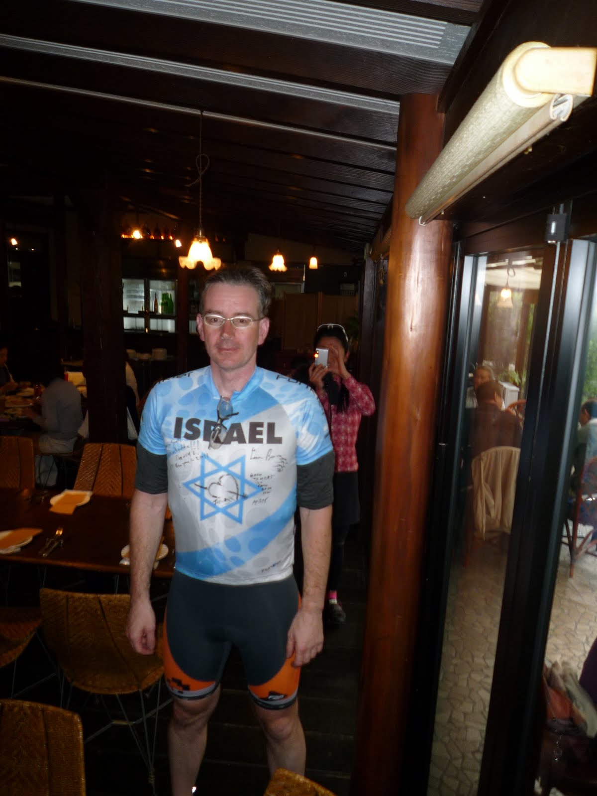 The signed farewll jersey — this time an Israel national version, as Naomi snaps a photo. We look forward to seeing Michael victorious riding in it in the Berlin road race he will join end-of-May: