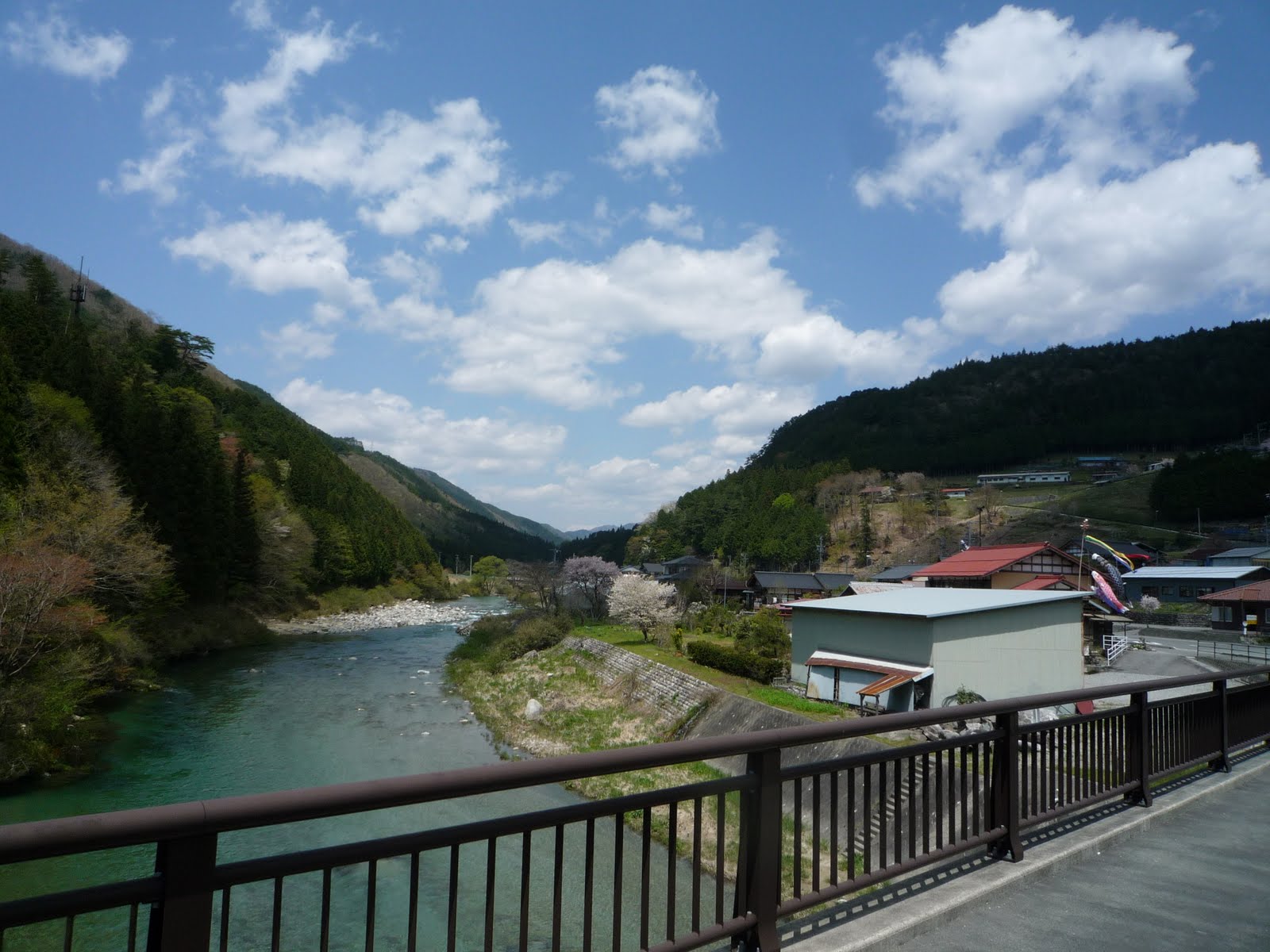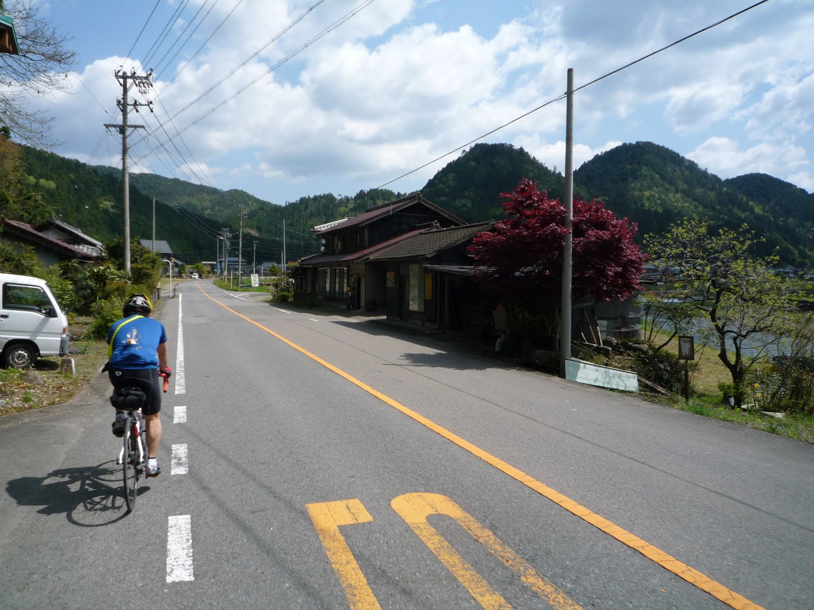 This segment involved a number of smaller climbs of 150-250 meters net elevation, the first on Rte 85 over a pass, then one up to a reservoir, then further up to another reservoir, then finally up a hillside to a tunnel entrance, and through the tunnel and down a real descent, into Gero and then Hida-Hagiwara, for a quick stop at PC2. 105 km done, 500 to go. The third segment started with another 21 km ride up crowded Rte 41 along the Hida-gawa, and just a few kilometers before Takayama turned East with Rte 361 and toward the day’s major climb. There were flowering trees and quaint villages everywhere, but my main impression of the second and third segments is of the sound running water. Almost everywhere, we are riding alongside rivers, streams, or just water burbling through the drainage systems alongside the road.