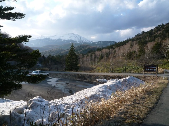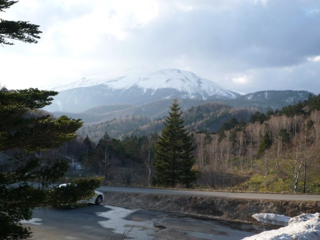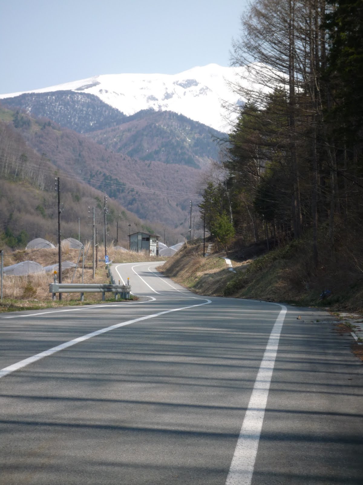 Up Rte 361, through tunnels, around reservoirs, a bit harsher, higher territory, and finally, the turnoff for Nomugi Pass — onto Rte 29 for the long climb. Again, I found myself alone — below is a photo of the lower middle of the climb and Norikura Mtn (before the first „false“ pass at 1375 meters, the descent back down to 1225, and the „real“ climb up to pass at 1670). (Today I see that this same stretch of road is photographed in Cycling Sports‘ Nomugi Pass write-up in the June 2009 special on the top 20 mountain passes of Nagano — the road pictured is probably a 9% grade, visibly turning up to 11% or so):