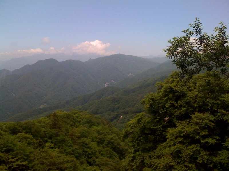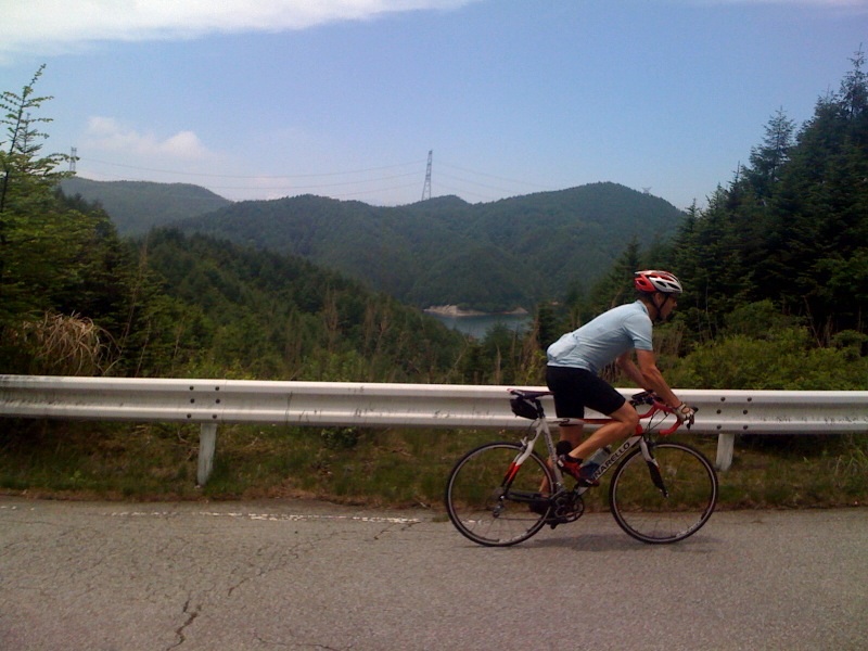 Anyway, back to the ride. The first climb was up Sasago Toge. This climb is every bit as beautiful as I had heard. Nice pitch, in the shade with some nice views. Dropping down the other side we briefly rejoined Rte 20 and soon turned off up Rte 218. This too was new to me and turned put to be a pretty tough climb with several parts at 11-13% (one bit at 14%). It took us up to Daibosatsuko (a reservoir) and then on to a peak at Kaminikawa Toge. Be warned, as I started to tire a bit the site of the reservoir wall up ahead was encouraging, however, the road goes on way above. I declared the top further up and stopped for a drink and an energy bar only to realise that after a short drop there was more climbing. At the real top we stopped to fill water bottles from a pipe. Just to check I asked the man sweeping the deck if the water was OK to drink: „Maybe, probably“ came the answer. We took our chances. Since this was a weekday we were likely to be the only people the Daibosatsu Talker would see and he was keen to talk. I asked him the name of the road we had just come up expecting it to have an interesting name but he told us it is called Rte 218. The road down the other side which we were about to take was Kaminikawa Toge (we were standing at the top of the pass). This leads down to the Fruit Line and would be a beautiful but in parts very challenging climb.