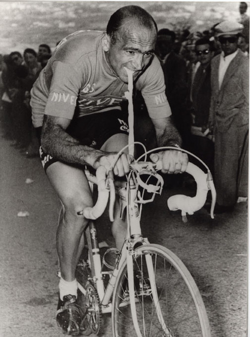 FM: JUST BEFORE THE STAGE STARTED I TRIED TO RIDE MY BIKE ON A CLIMB AND I NOTICED I COULDN’T USE THE MUSCLES OF MY LEFT ARM TO PULL ON THE HANDLE BAR VERY HARD. SO MY MECHANIC, FALIERO MASI, THE BEST MECHANIC OF ALL TIME, CUT A PIECE OF INNER TUBE AND SUGGESTED I PULL IT WITH MY MOUTH. THAT WAS A GREAT IDEA!