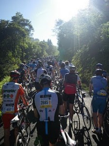 My overall impression was that the riders were fast and experienced, though over the day I did end up chatting with a lot of Brits who had not done much mountain training. The first proper climb was the Col de Marie-Blanque. With all pre-race chat about the Tourmalet climb this one and the next climb (Col de Soulor) did not get much mention. I had read that many pros do not like it because it is narrow and has an uneven gradient, thus not allowing them to get into a rhythm. Eddy Merckx, however, loved it because he said he could really make his rivals suffer. Although we had ridden over 50km the group had not really broken up much. It is difficult to climb on a crowded road because you cannot settle into your own rhythm. Motorbikes and the occasional ambulance or police car with siren reminding me of Inspector Clouseau movies would pass pushing riders over to the side. Once the gradient kicked up to 12 & 13% many riders dismounted and annoyingly, the road was blocked. We had to walk the last 1.5-2kms, thus losing a lot of time. The walk gave me the opportunity to talk to a Brit who it turned out used to live in Japan, is a good friend and roommate on the Paris-London charity ride of Laurent D. In fact he had even mentioned Positivo Espresso. Global reach!