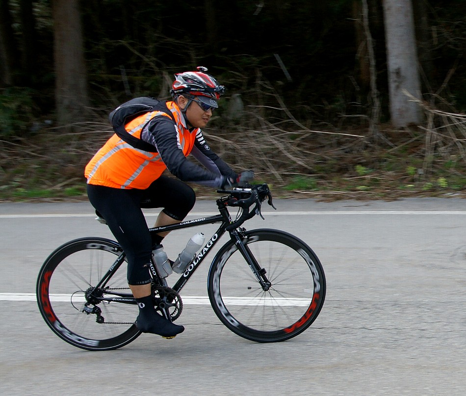 Now the orange bullet really started to fly — down Machida Kaido, then Onekansen, with a slight tail wind to ease the pain. The reflective vest, and my flashing fibre flare, must have made me the most visible cyclist in Japan for a hour or more. … unless the rider from the May 1 600 km Brevet who had a similar Mavic vest happened to be out at the same time. Do people wear these in Europe? The label said something about compliance with European Union requirements? Why wasn’t Sarkozy in one of these for his cycling photo op?