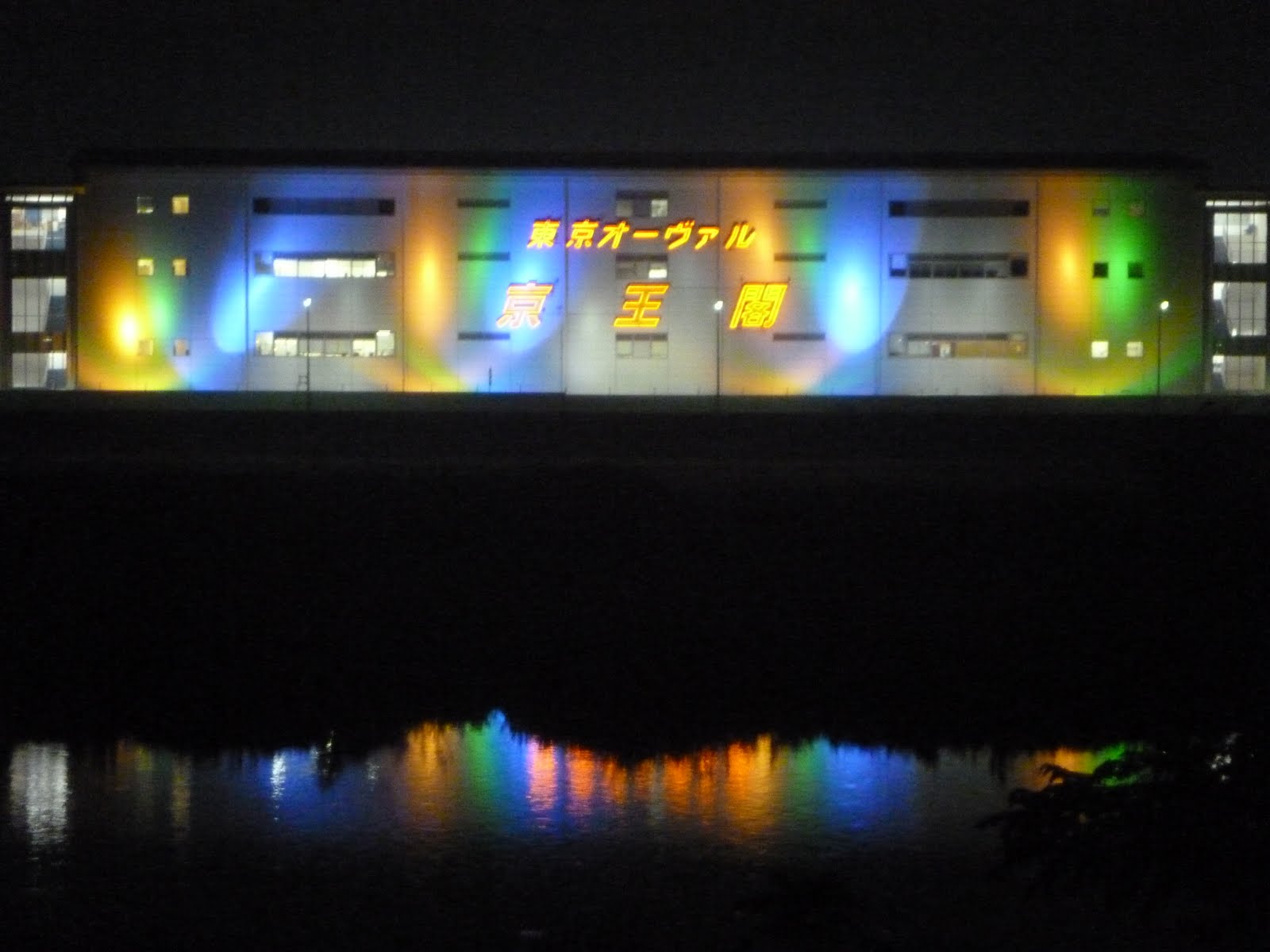 the award for „most visible“ rider in May … but will have competition if he happens to ride theChubu Audax October event.In any event, I made good time, and after a quick water stop, enjoyed the ride down the Kawasaki side of the Tamagawa. This afforded a good view of the Keirin track (Tokyo Oval Keio Kaku), which, like many other buildings, looked totally different at night. Not better, not worse, just different.