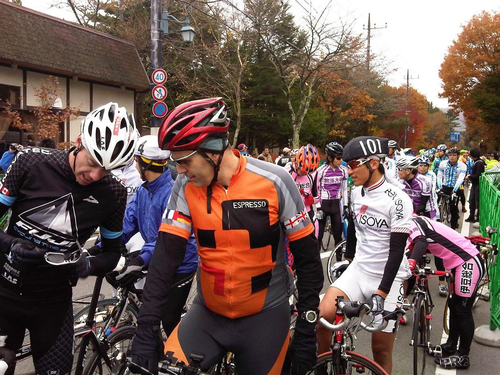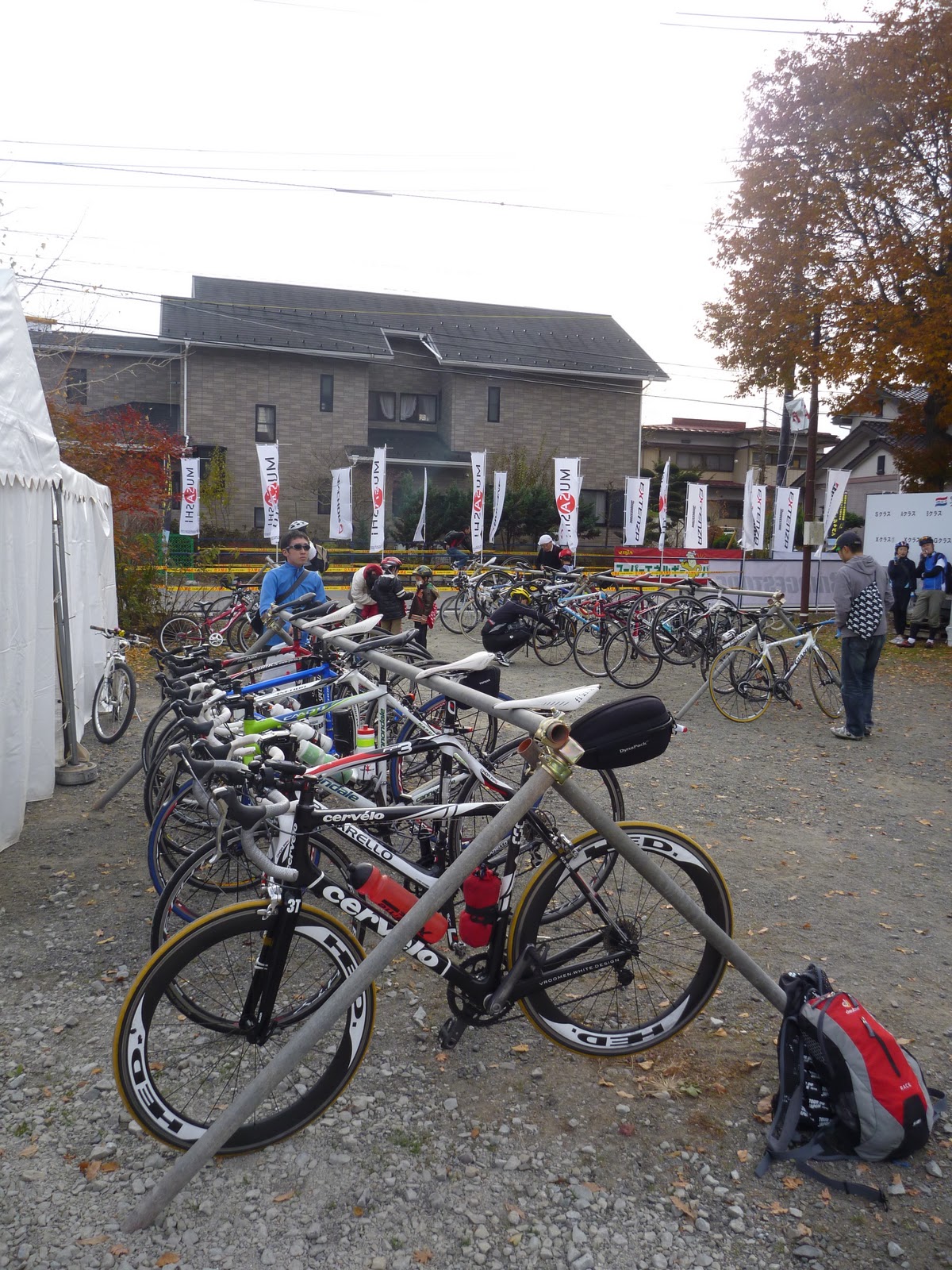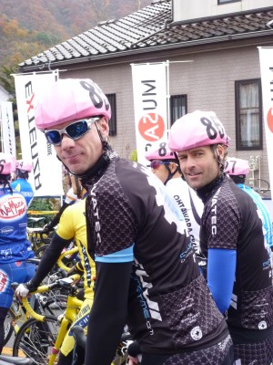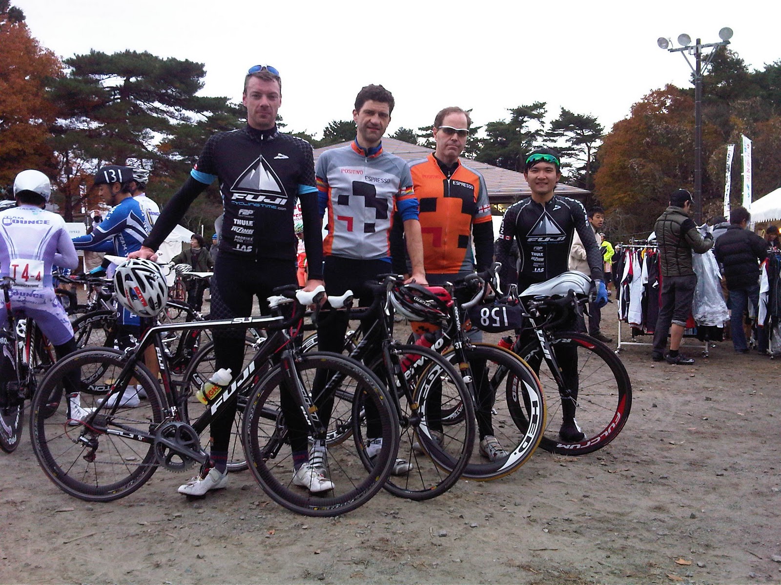 In any event, I volunteered to „lead out“ the TT team, and gave it my all for the first 1 or 1.5 kilometers, then pulled off and let James, Kawaguchi-san and Ludwig go ahead. The cool morning air and brief tough effort had left me gasping for air, but I was happy to accomplish my 2 main goals for the event. (1) a strong lead out — at times going 45-50 kph (or more) on the straight away and gentle downslope, and (2) not crashing in front of James M. and bringing him down, ruining his hopes for a finish „in the points“ that would assure/improve his position for the various championships. James, Ludwig and Kawaguchi-san cruised to finish in 6th place — just a warm-up — as I trailed far behind and pulled off, mission already accomplished (sort of) after finishing only one of two laps.