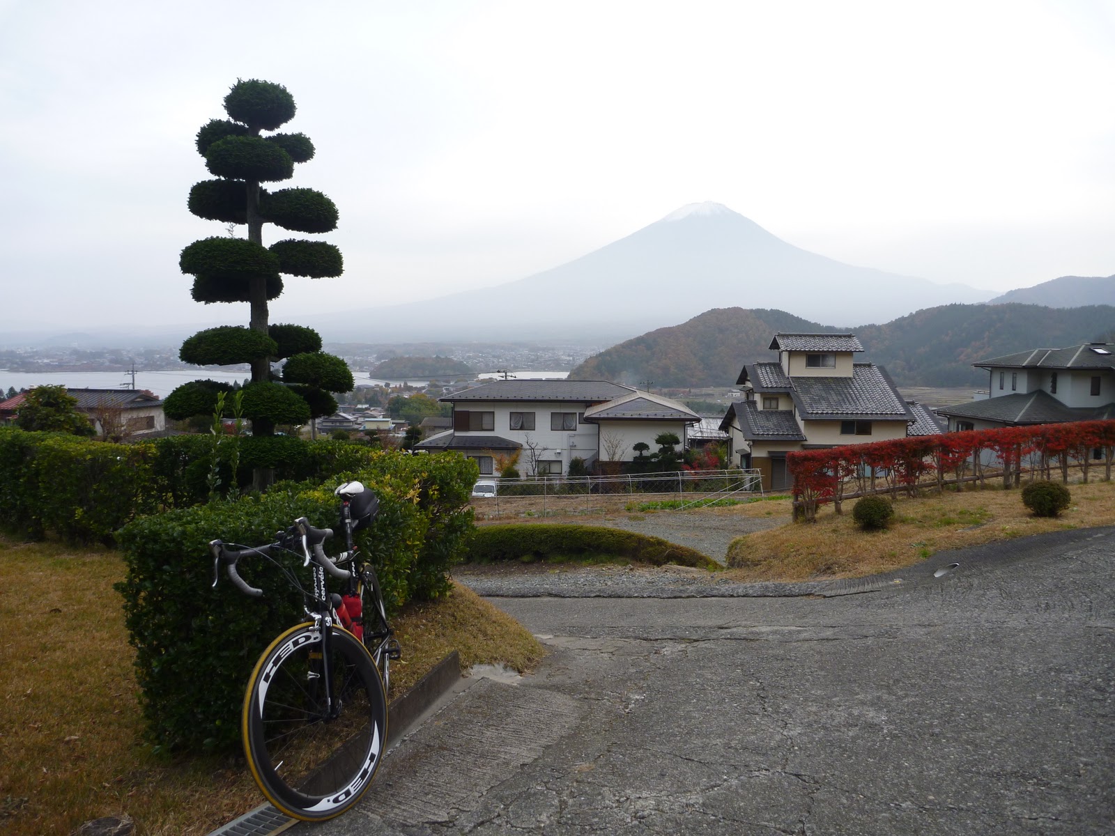| Bike leaning along hedge, at our accommodations with view of Fuji. |