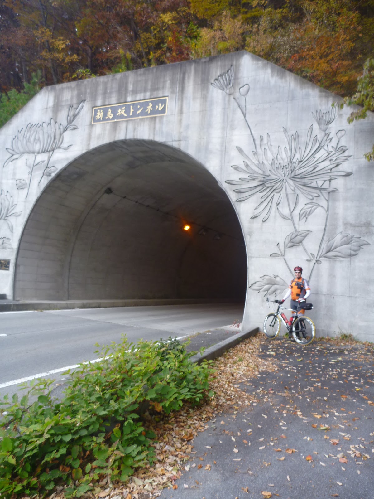 Looking from Oishi village toward the Wakahiko tunnel entrance — a little after-race climb up to the entrance and then a continuing modest upslope inside the tunnel for a little more than 2 km.
