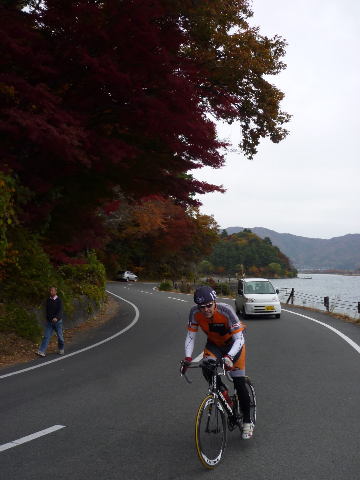 By contrast, the race was a piece of cake in terms of power. In the first lap, my heart meter would not work because I did not sweat… Though I certainly felt like sweating because of stress. There was one newbie rider in the middle of the top field who would swerve in every tighter curve and threatened to fall of the bike or crash into others uncountable number of times. Every time people would scream. At some point, I shouted obscenities at him, amusing the rest of the field. Unfortunately, he would not relent and kept scaring the hell out of me. I tried to keep distance without losing too much distance to the top. Down the lake it was relatively easy to coast without being fully in the draft of the field; then against the wind, I tried to be ahead of the guy in the narrower top of the peleton.It somehow worked, though on the return journey in lap three another stupid rider couldn't keep the pace line in a tighter curve and caused an innocent rider to crash while he continued, just next to me (fortunately I was on the inside). I felt like pushing him off his bike!Highly stressed but well rested I approached the final tight turn and climb in lap 3, strategically positioned pretty much in the front of the peleton. Another rider moved up besides me, tapped my shoulder and signalled I should go for Number 1. He knew me from winning last year. I indicated not today, but knew that he would go for it, so all I needed to do is jump on his wheel as he moved ahead, disappointed my response.This worked well and got me up the initial hill right among the first few riders, drafting him nicely. I knew he would not be able to keep up, and others would close on. So they did, and rather aggressively, pushing some to the edge of the road. I was fine, but it was not confidence building.Then we passed the site of a horrible crash in the C1 class that had started 2 mins ahead of us. Riders sitting and lying by the road side, holding their bleeding heads. These are the moments where I wonder whether I should stop right there and slip into my paramedic skin. It is really hard to keep going. I did, and had no problem drafting others up the final hill, but my fighting spirit was seriously dented. Last year, people had crashed a couple of times, actually in similar spots, but always behind me – and I have a policy of not looking back. This year, I saw it all in front of me.Beyond the top of the hill, there was a bit more space to sprint, and so I fought again, hanging on to wheels and jumping a few, but clearly just a little too late a sprint start to make it to the very front. I thought I finished sixth, but wasn't sure – one tends to overestimate one's own result when there are so many so close. The results confirmed I was sixth and thus just on the podium.In just race I thus made it from C class to B class – but I'm not sure I want to race again. 90 percent of the riders are just safe and good, but the remainder make such a race so incredibly dangerous. I'm glad I survived once more, but should I tempt fate again? Some say the higher you get, the better the riders become – but then JCRC throws in these newbies into just any class in these popular races, so one can never be quite sure.Racing aside, it was a lovely weekend around the lakes, really thanks to David getting us that great accommodation and getting us invited to a wonderful dinner. This and the nice autumn colours (I think better than ever before) really made up for the stress of fearing and seeing all these crashes.