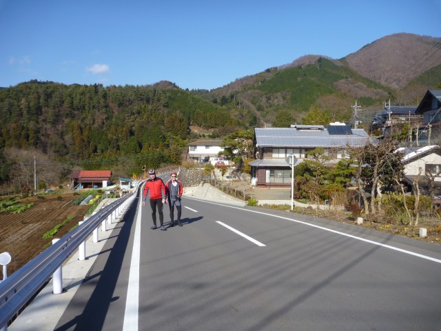 The sunlight helped to keep the cold tolerable most of the way to Itsukaichi. But as soon as we started into the Akigawa valley and hit long, uninterrupted stretches of dark shadow, still just after 9:00AM, it got fricken‘ (or is that „fracken“ or maybe „effing“?) cold. I wished I had a face mask, even though I was working hard and climbing gradually. Eventually, the steeper climb up to Kobu Tunnel seemed to do the trick, and the warm sun on the Uenohara side felt glorious.