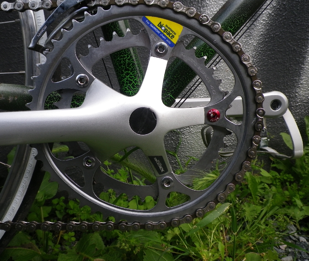 Well after having now some experience with bikes I have to confess that this isn’t a very good bike. Well it is size 54 cm which doesn’t fit me at all. The frame is made out of Vitus 999 tubing, quality wise two notches up the standard of water pipes (say: Reynolds 501 or Columbus Aelle). Non butted, plain gauge. So the bike is pretty heavy with 11.1 kg. The components are mostly Shimano Exage 300; this is the Nineties equivalent to Sora and Tiagra. From the stamping one can see that the bike was built in 1991. But I like the Biopace chain rings, as I had them on my first Panasonic racing bike and also the old, shining Alesa 913 rims are good looking things. The handle bar is from a now defunct German company called Friko.