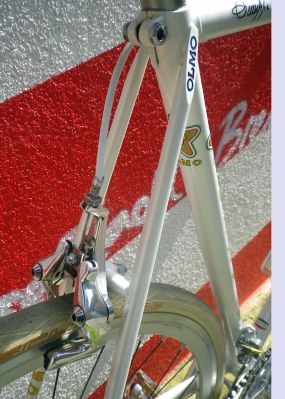 The steel frame was made by Kotter, a company from the South of Germany for their own racing team. The frame was chromed first and then painted with a thin layer of lilac paint, so that the chrome is shining through the paintlayer from underneath. It is hard to see the real beauty of the frame on a photo – one has to see the frame on a nice autumn day outside in the sun. This called „Chromovelato“ in Italian.