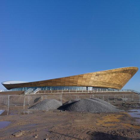Was mir besonders gut gefällt ist, daß die Form und das Material der Hülle des Gebäudes sich an die Form der Bahn anlehnt. Man könnte meinen, dass das Rennen auf der Innenseite der äußeren Holzbeplankung stattfindet.