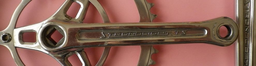Letztens hatte ich hier über die Kurbel an dem blauen Chesini von Hiroshi, C Speed Yokohama berichtet. Die cih unbedingt haben wollte. Inzwischen hat Hiroshi mich aufgeklärt, es handelt sich um eine Velo Orange Grand Cru 50.4bcd Crankset Kurbel. Schön, aber für $200 auch ein wenig teuer. Und letztendlich ist das ja auch nur die Kopie einer Stronglight 49D Kurbel. Also gebe ich mich zufrieden mit meiner Stronglight TS, die Tobias netterweise für mich poliert hat. Ich könnte die also irgendwo montieren. Leider könnte ich die dann nie wieder abnehmen, da diese Franzosenteile dummerweise andere Gewinde haben, so daß Standardabzieher hier nicht passen (23,5mm x 1). Tobias meinte auch, dass die vom Material her schon sehr brüchig ist. Ist also mehr etwas zum anschauen und für die Vitrine.