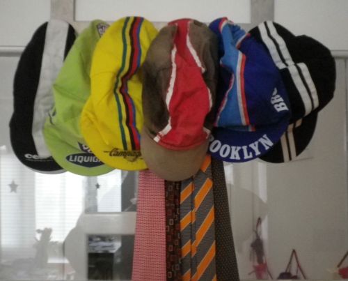 Eigentlich sehen Radkappen, wenn nicht beim Radfahren getragen, ziemlich bescheuert aus. Also eigentlich noch schlimmer als Baseballcaps. Aber beim Radfahren sind sie eigentlich unentbehrlich. Vor allem wenn man in einen Regenschauer kommt. Wem schon einmal die Plörre von der Stirn in die Auge gelaufen ist und nichts mehr sehen konnte, der weiß einige von diesen billigen Radkappen doch zu schätzen. Natürlich müssen Sie auch stilistisch zur Kleidung, zum Rad und zum Helm passen. Für alle Fälle habe ich ein paar kleine schwarze Fummel, darunter eine Teamkappe des nicht mehr existenten Cervelo-Teams. Eine gelbe Campagnolo Kappe mit Regenbogen Weltmeistertreifen ist sicher im Straßenverkehr und passt zu allem und nichts. Eine rote Kappe für rote, und eine blaue Kappe für blaue Räder. Eine Liquigaskappe für meine Kawasaki Z900 aus den Siebzigern.