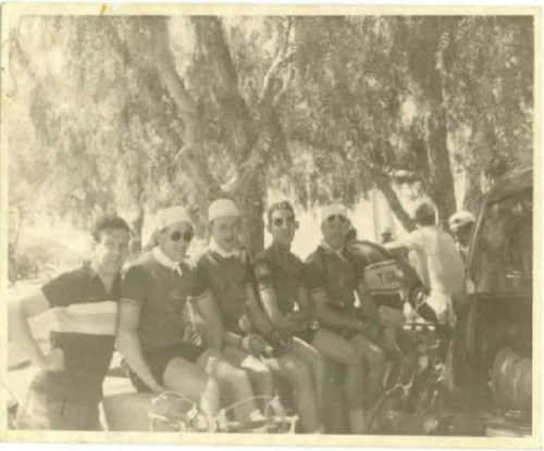 Nein, das hier ist kein Photo, daß bei einer Ausfahrt nach Syke mit einem iphone gemacht und mit Instagram bearbeitet wurde. Das ist wirklich ein altes Photo. Es zeigt Alf Butler ganz links und Alan Jacob mit Sonnenbrille direkt neben ihm bei der Tour of Tunisia 1960.