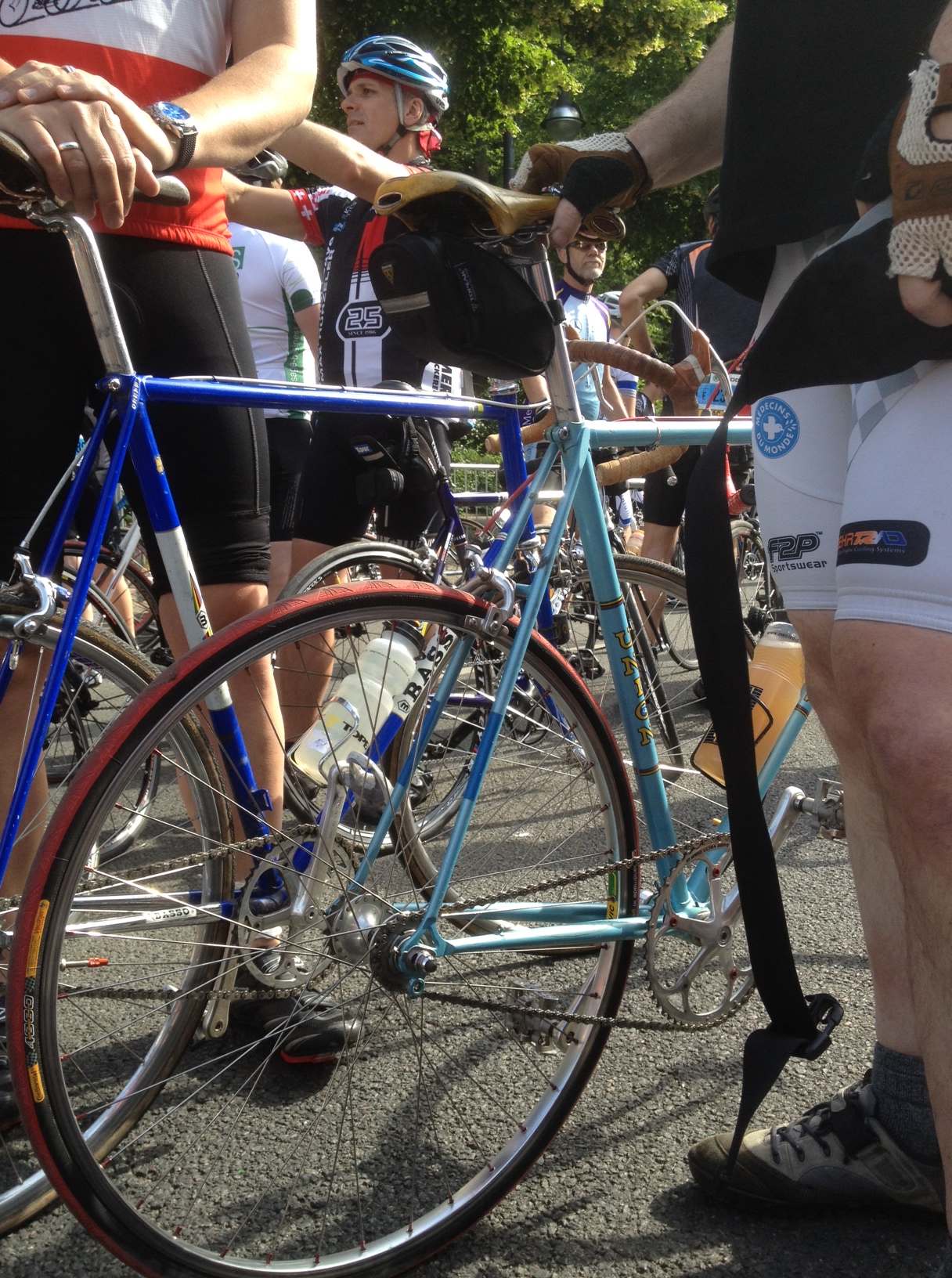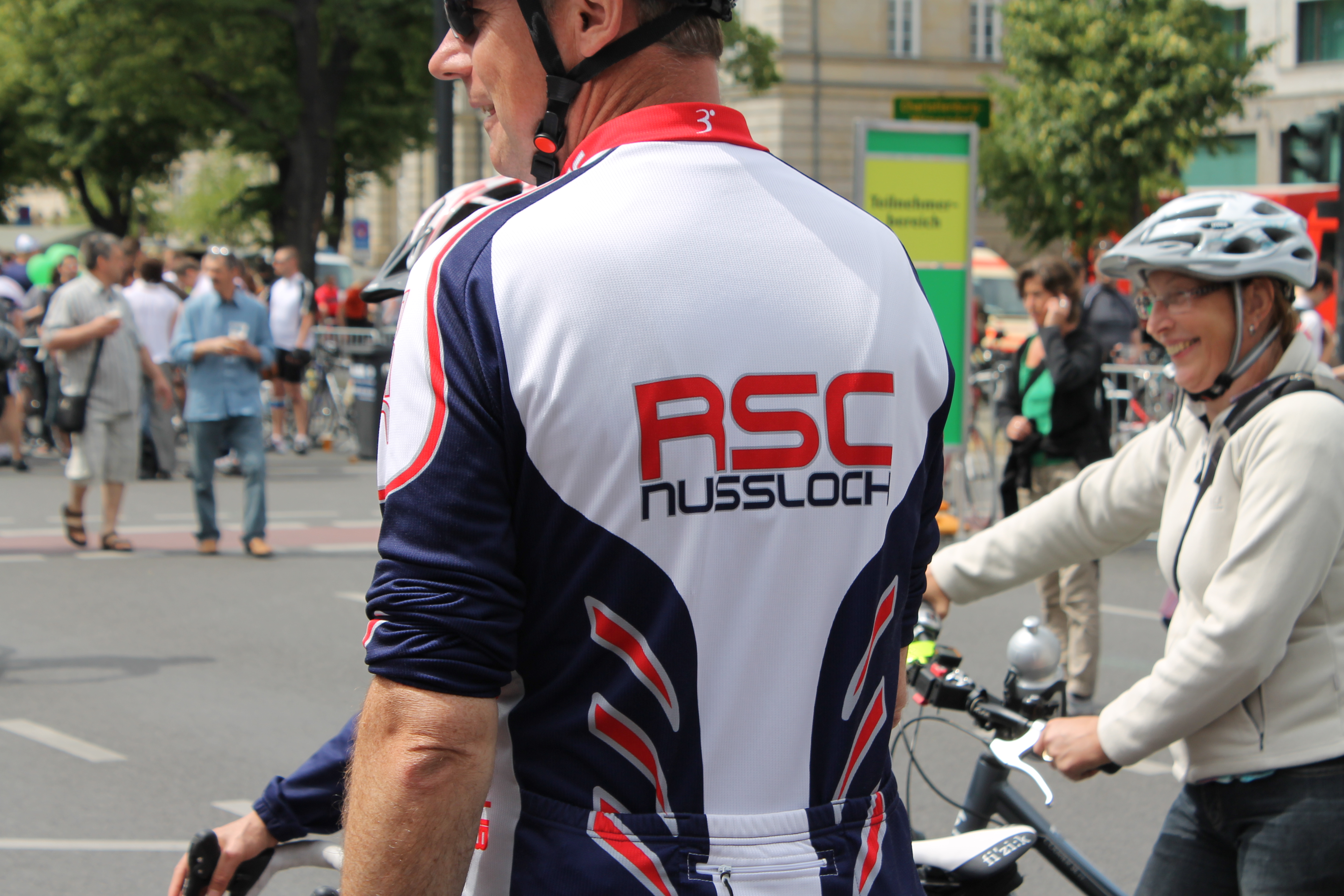 Das Wetter war mal wieder fantastisch. Die Straßen waren voll mit Radlern, teilweise von relativ exotischen Orten. „Nußloch“ hinten auf dem Trikot finde ich OK, auf der Hose aber eher ungünstigt. Auch „Himmelspforte“ hinten auf der Hose geht gar nicht. Ich sah ein schönes Jersey in den drei Farben der Trikolore und dann entschieden wir uns schon die Kontrolle am Eingang zum Startblock zu umgehen und mich und mein Rad über die Absperrung zu heben. Zack war ich drin. Warten. Kalt werden.