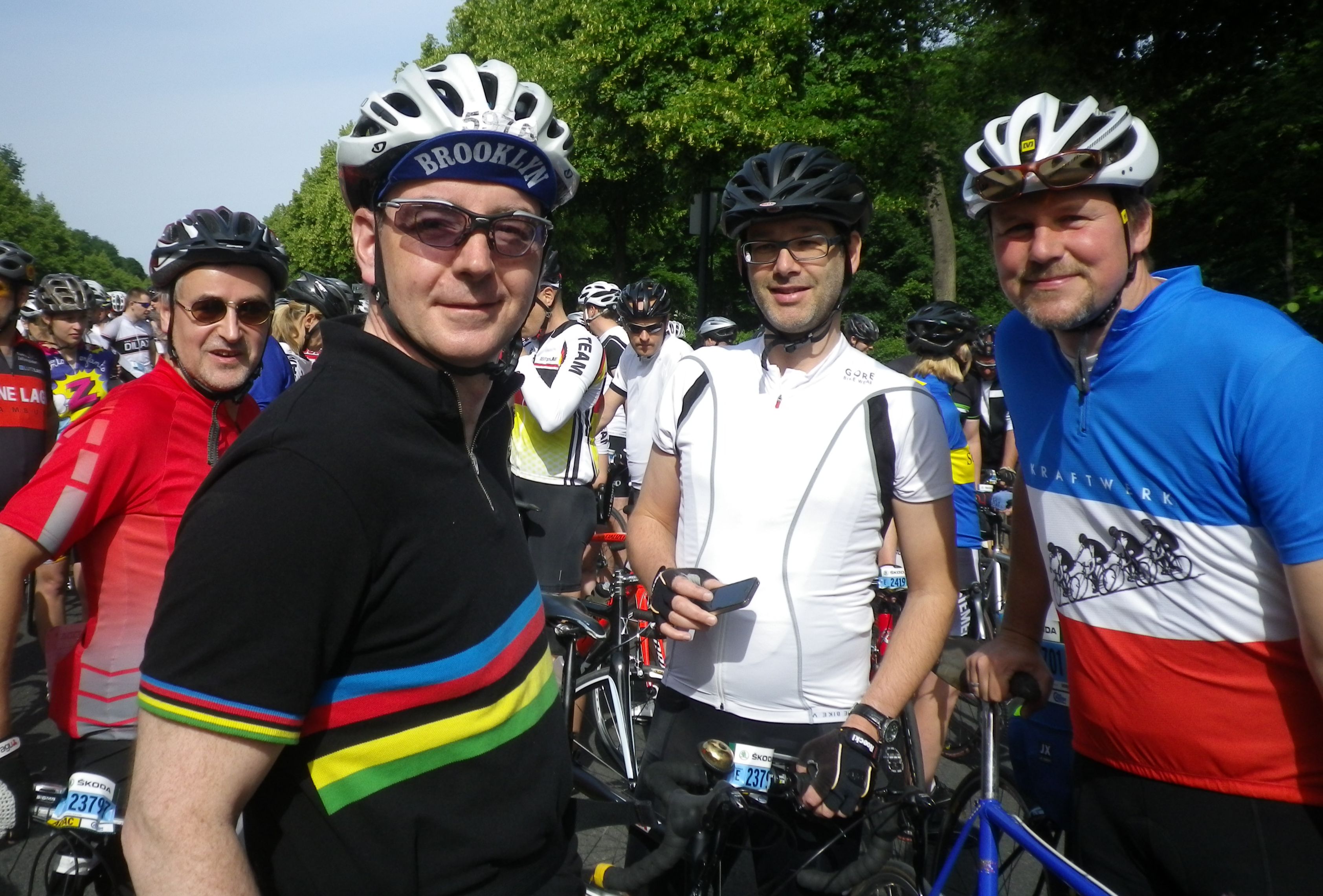 Das Trikolore Jersey kam von hinten auf mich zu. Oh, das war ja gar nicht die französische Nationalmannschaft, das war ja das Original Kraftwerk „Tour de France“ Jersey. Cool. Ich schaue auf das Rad dazu: Single Speed? Hendrik, wie ich nachher erfuhr macht in diesem Moment dasselbe: Er schaut auf mein Rad, denkt: „Single Speed?“ Wir sehen uns an und schütteln uns die Hände ohne ein Wort gesprochen zu haben. „Dr. Livingstone, I presume?“ Vielleicht sind wir von 15.000 Teilnehmern am Velothon die einzigen die auf Single Speed bzw. Fixie Räder fahren. Veileicht auch nicht, aber ich habe noch nie jemanden gesehen. Und wir treffen uns zufällig in der Mitte des Startblocks E. Hendrik hat ein schönes, altes Basso fast komplett mit Shimano 600 (6200) ausgestattet. Sehr schön, wir entscheiden zusammen zu fahren.