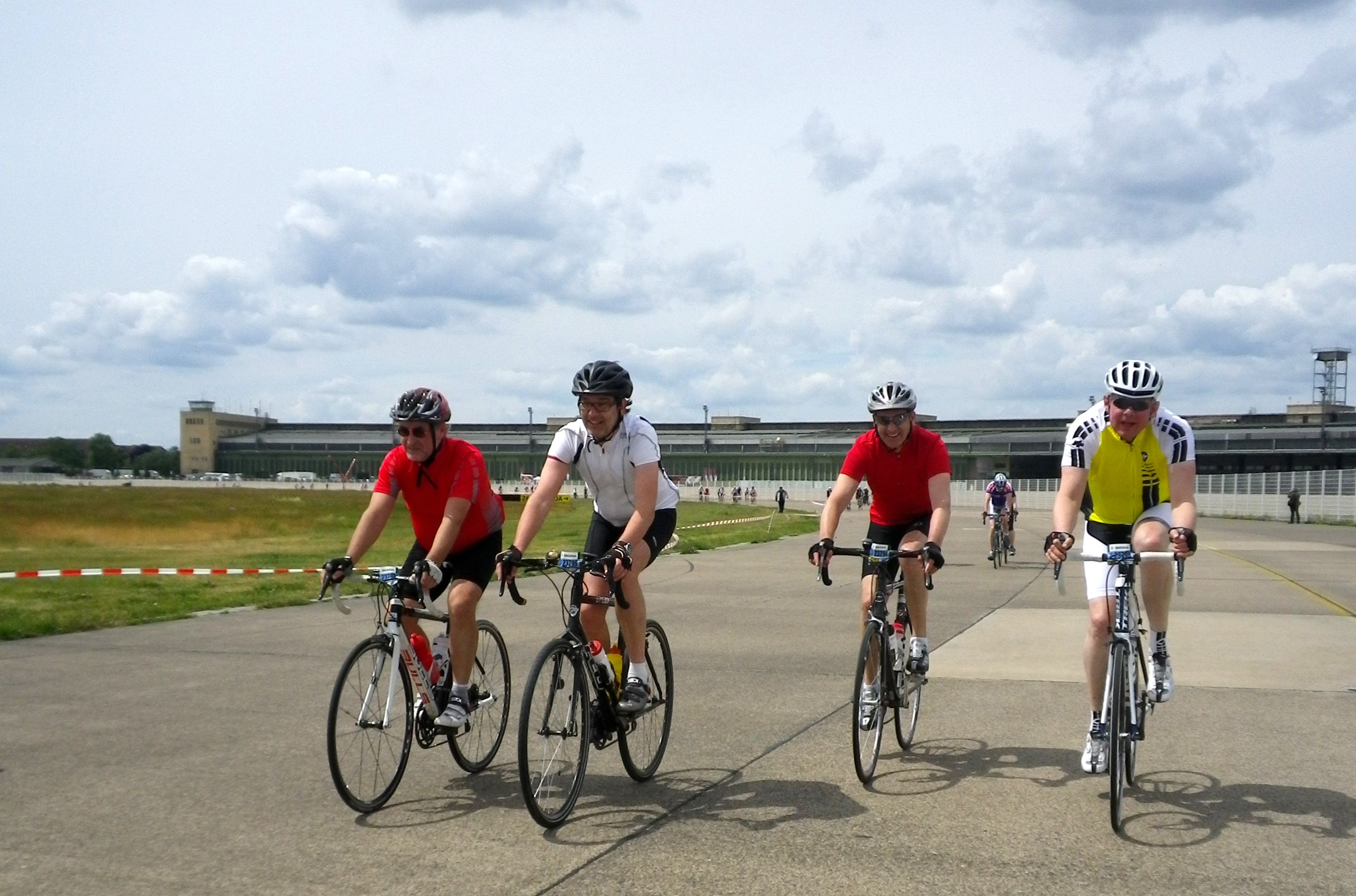 Und schon sind wir wieder in der Stadt. Erstaunlicherweise sind viel mehr Fahrer in der Stadt als draußen auf der Autostraße. Die Strecke führt uns über den ehemaligen Flughafen in Tempelhof der eine Art Windmagnet ist. Diesmal ist die Streckenführung aber sehr kurz, so dass es nicht so schlimm wird wie in den vorhergehenden Jahren. Wir machen ein paar Photos (*für das Blog*) und schon geht es weiter.