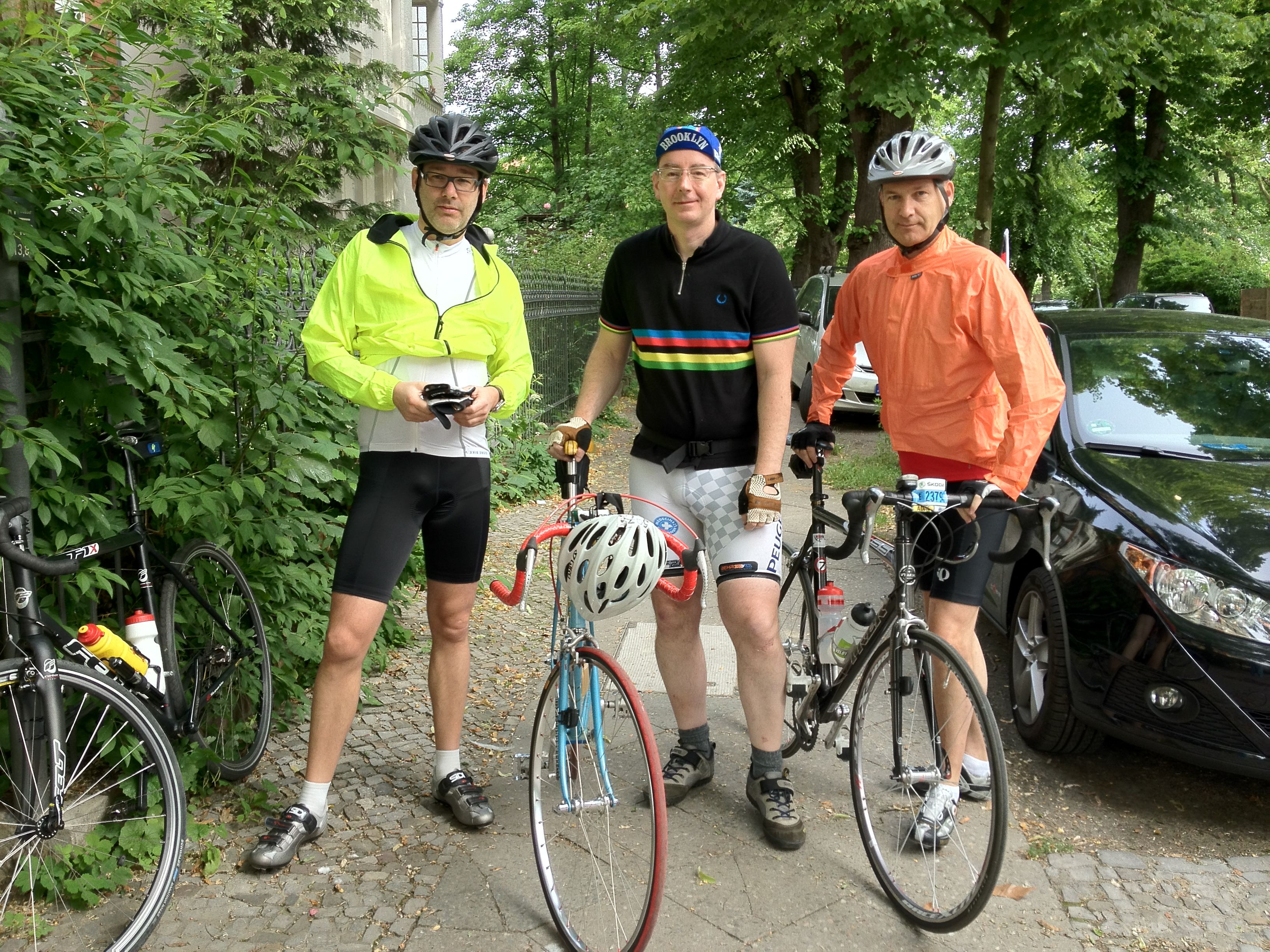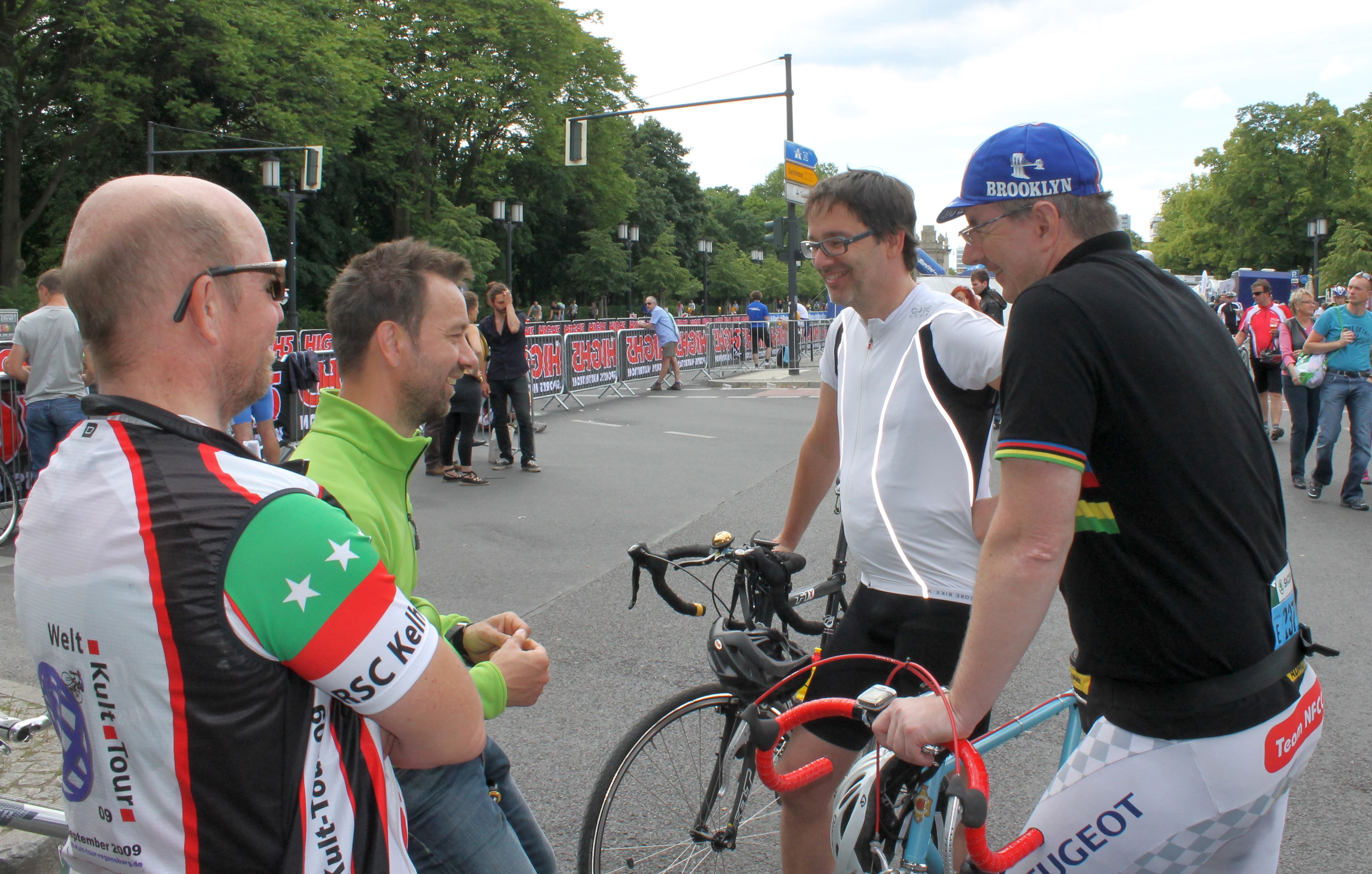 Schnoop schickt eine SMS und wir treffen uns unter der S Bahnbrücke am Tiergarten. Karin machte den 30. Platz beim 60 Kilometer Rennen. Sie sollte also viel mehr zu schreiben haben als ich mit meinem 4361. Platz oder so. Torsten ist auch da auf einem sehr schicken Kalkhoff Rad und auch Uwe als Kelkheim. Von dem ich immer noch keine Ahnung habe, wie er heißt – doch jetzt schon! Karin zeigt mir in 3D wie sie einige ihrer riskanten Überholmanöver und Sprints gefahren ist und männliche Konkurrenten im Staub hinter sich gelassen hat. Es ist gut Menschen aus der „Heimat“ zu treffen, denn ein wenig neidisch auf den unbegrenzten Nachschub an Pforzheimern bin ich schon.