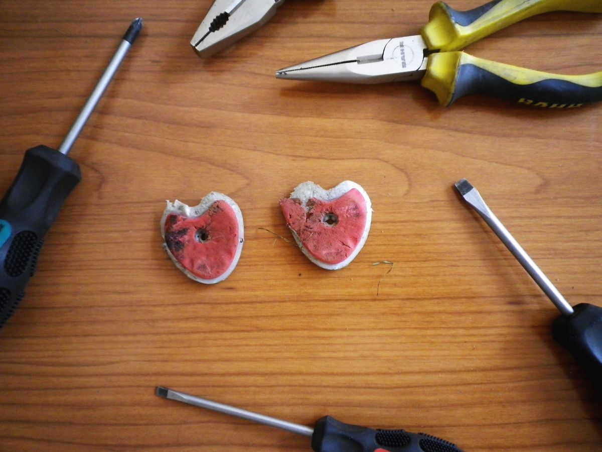 Rechts der Absatz des linken Schuhs, der einfach mehr gebraucht wird da ich immer zuerst den linken Fuß auf den Boden stelle. Ich habe immer ein wenig Sorge, dass ich die Hülse der Absatzschraube aus dem Schuh herausreisse, aber bis jetzt ist es immer gut gegangen. ein paar Schraubenzieher, Zangen, Gewalt, fertig.
