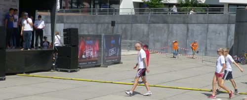 Ich hocke mich mit Astrid und unseren Erdinger Alkoholfreien wo hin und warte auf die Siegerehrung. Diese beginnt wie die am Silbersee – nein eigentlich noch schlimmer, denn zunächst werden auch noch die Sieger der Polizeimeisterschaft gekürt. Dann beginnt es wie üblich mit der Ehrung der Altersklassen und Geschlechter, mir schwant böses. Aber zum Glück wird nur der erste Platz dort prämiert und Männer und Frauen kommen gleichzeitig auf das Podest. Dann kommen endlich die Staffeln dran und Anna, Philipp und Jannek holen sich ihr Pokälchen ab. Ein großartiger Moment in der noch jungen Geschichte de Hochschule, die ersten Seiten der Ruhmesblättchen werden geschrieben und die erste Inschriften in der Ruhmeshalle der HIWL eingemeiselt. Ja, so könnte ich noch stundenlang herumschwadronieren, Tatsache ist aber das der Pokal von der Hochschule eingesackt wurde, da die Hochschule auch die Teilnahmegebühren übernommen hat – so hart können Verträge sein.