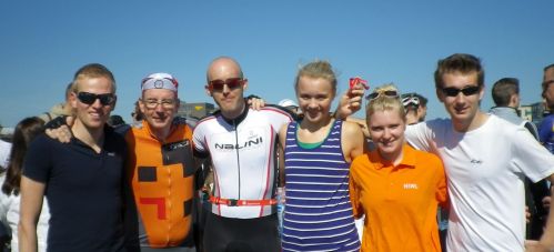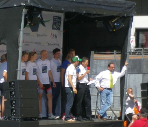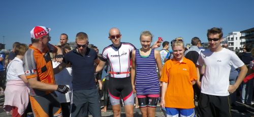 Im Vorfeld geht mal wieder so einiges schief. Es fängt an damit, dass ich träume, wie ich von syrischen Truppen in Aleppo entführt werde und für Assad und seine Familie auf einer Party japanische Enka (Volkslieder) vorsingen muss. Nein, dass habe ich nicht geträumt, aber mir gewünscht, damit ich nicht teilnehmen muss. Ich bin trotzdem um 9 am vereinbarten Treffpunkt aber niemand ist da und mein Hinterrad hat einen Platten (vermutlich von syrischen Guerillas). Mich macht das immer ein wenig nervös, aber deswegen haben wir uns ja auch 2 Stunden vor dem Start verabredet, so dass wir alles in der Zeit noch in den Griff kriegen. Dennis taucht auf. Philipp kommt auch, Anna kommt auch und ist sehr groß. Größer als mein fünfzehnjähriger Sohn, größer als meine Frau und wesentlich größer als meine elfjährige Tochter. Ich haue ab und flicke mein Hinterrad, das klappt auch gut. Jannek taucht irgendwann auf. Die Zeit geht rasend schnell vorbei und schon sind die Schwimmer im Wasser. Philipp und ich machen uns zu den Rädern. Wie immer (also zum zweiten Mal) sind wir nicht richtig aufgewärmt und müssen gleich losfahren.