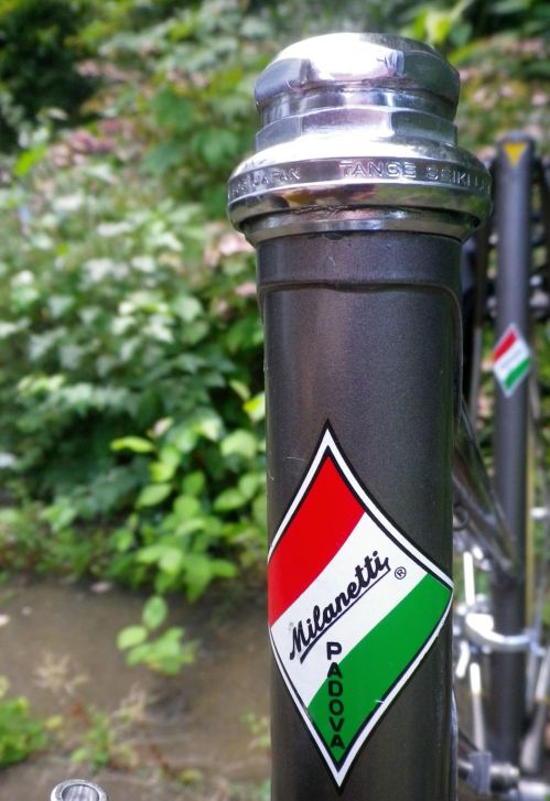 Das Rad ist in gutem Zustand und einigermaßen „epochengerecht“. Ich schätze mal Endsiebziger oder frühe Achtziger, denn es gibt keinen Anlötumwerfer, aber Zugführung unter dem Tretlager und Innensechskanthülsen für die Bremsaufnahme. Der Steuersatz scheint ein neuerer Tange Levin zu sein, ansonsten ist die Schaltung komplett Shimano Golden Arrow und die Bremsen Weinmann (will ich nicht) und Modolo Sport Bremshebel, die ich noch nie vorher gesehen hatte – sehr schön.