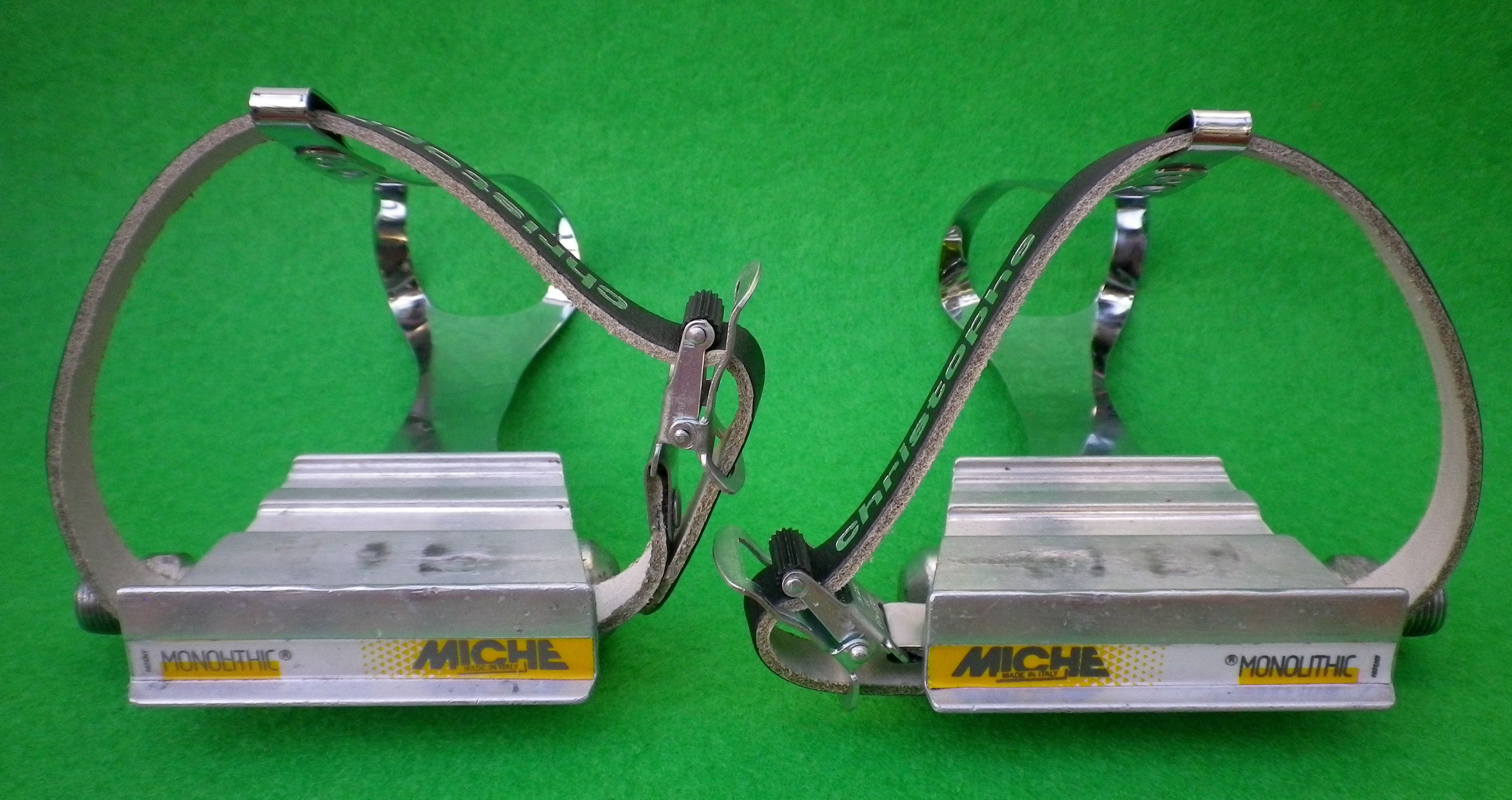 Ich hatte ein Paar Miche Monolithic Pedale per Zufall sehr günstig bekommen; aber ehrlich gesagt glaube ich nicht, dass die Gruppe sehr hochwertig gewesen ist und so waren auch die Pedalen sehr schwergängig. Aber die Konstruktion selber ist recht charmant und ungewöhnlich, eben sehr monolitisch. Nun neu eingestellt und aufgemotzt.
