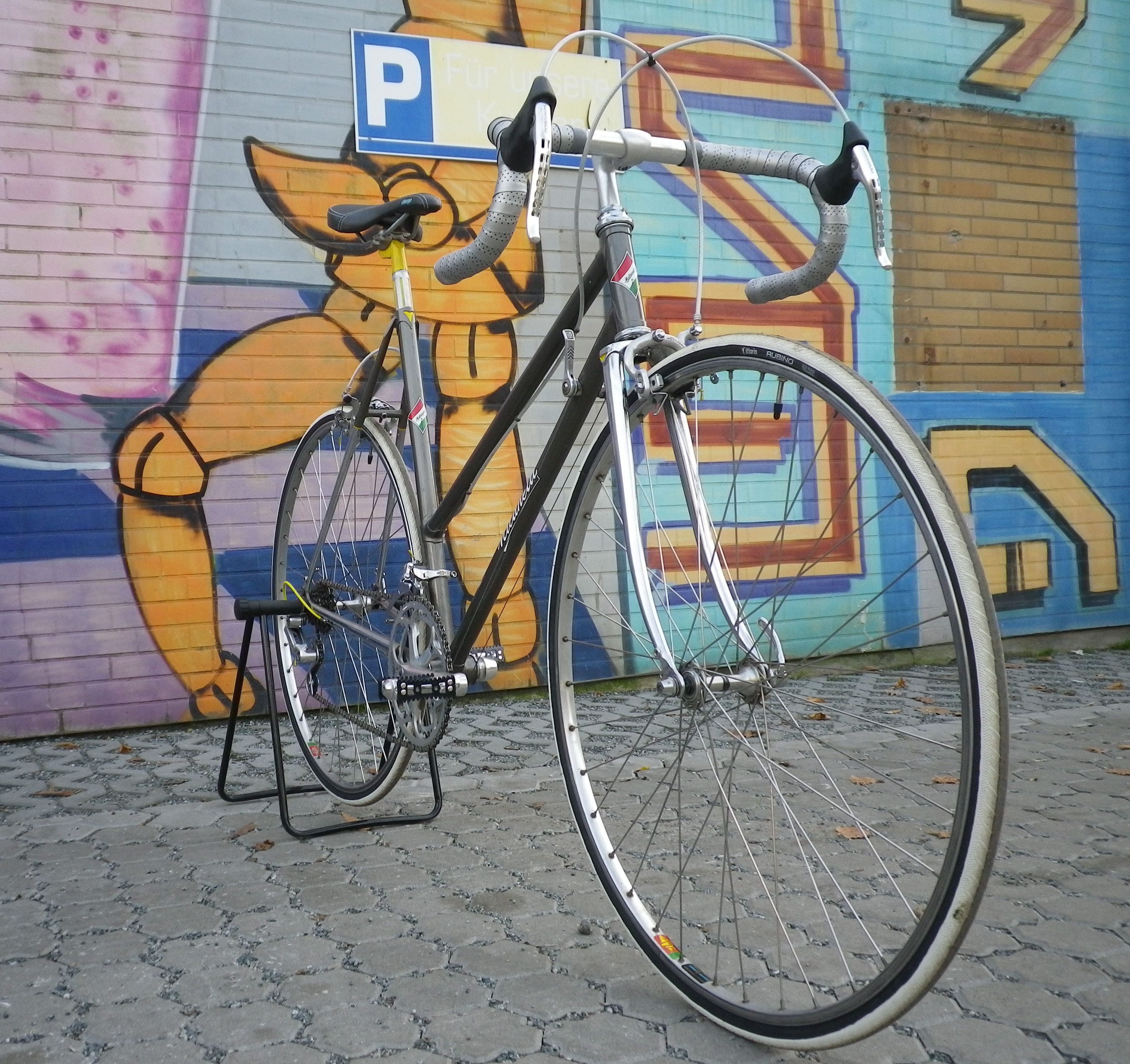 Die Laufräder sind alte Shimano Naben mit Mavic Modul E2 Drahtreifenfelgen und schwarz-weißen Vittoria Rubino Reifen.Vorher waren da Mavic GP-4 Schlauchreifenfelgen dran, das finde ich aber für ein Damenrennrad sehr unpraktisch.