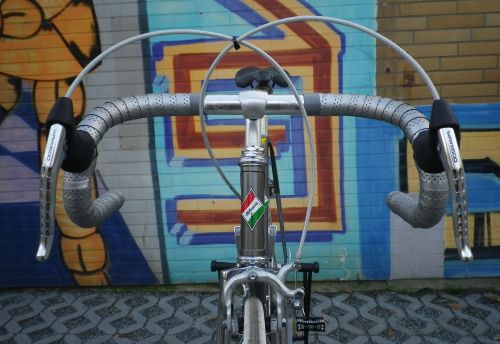 Und gerade habe ich noch einmal nachgelesen, wie ich mir vorgestellt habe, dass das Rad werden sollte. Die Campagnolo Veloce Bremsen, die ich auch gekauft habe, machen wirklich viel Sinn, sehen aber leider nicht zeitgerecht aus. Auch das gekapselte Innenlager wäre gut gewesen, da gab es aber einige technische Schwierigkeiten. Und dann hatte ich zunächst den rechten Schalthebel an den Vorbau gebaut, denn es ist unpraktisch so tief an den Rahmen zum schalten zu greifen. Das war ein hübsches Experiment, brachte aber auch nicht so wahnsinnig viel.
