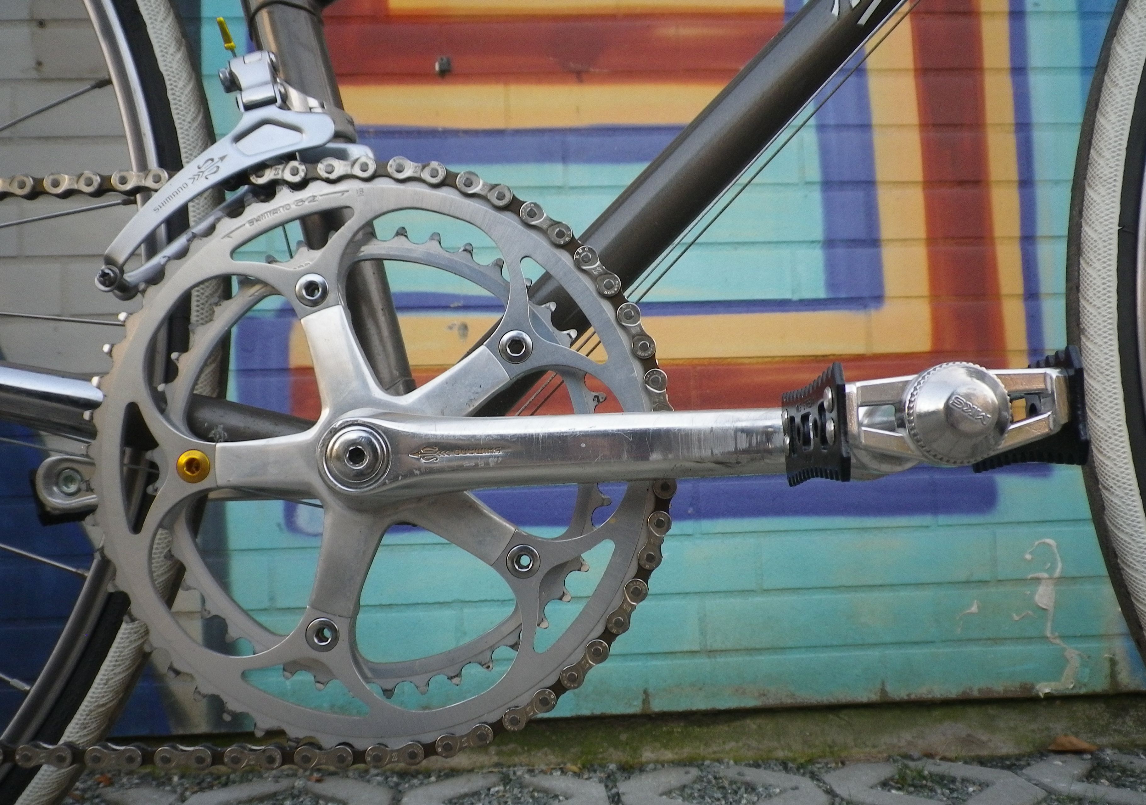 Die Pedalen sind schwarze MKS Stream; die sehen nicht nur gut aus (notfalls kann man auch Haken montieren) sondern sind auch von beiden Seiten fahrbar, sehr stabil und sehr schmal. Eigentlich die idealen, praktischen Pedalen für wenig Geld.