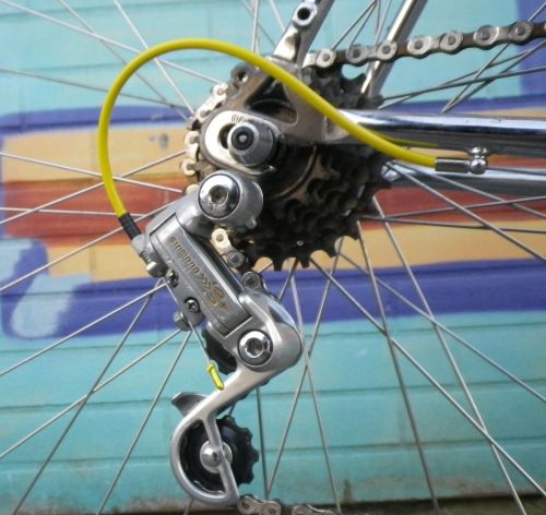 Farblich ist das Hauptthema Grau (Rahmen) und Silber (Züge, Chrom) mit ein paar gelben Akzenten (Sattelstütze, Muffen, Schalthülle, Zugenden, Kettenblattschraube). Zunächst wollte ich viel mehr „Gelb“ an das Rad bekommen, aber das sah einfach nicht gut aus.